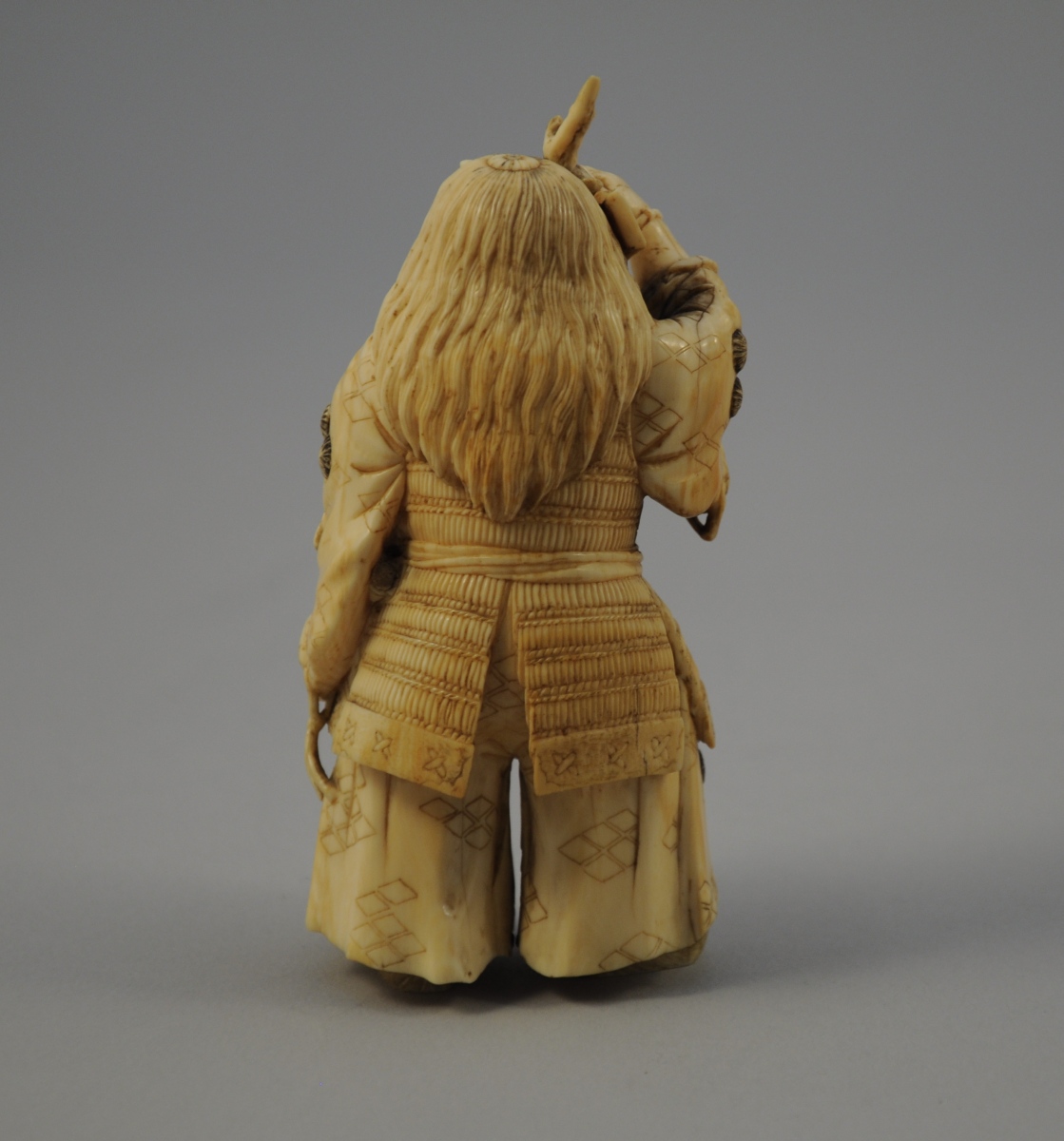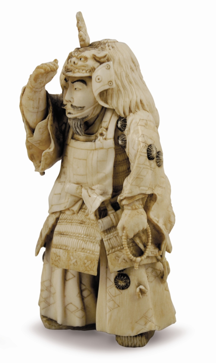 OKIMONO en ivoire à patine jaune, figurant un samouraï debout en armure et kabuto, la main droite levée au niveau des yeux.