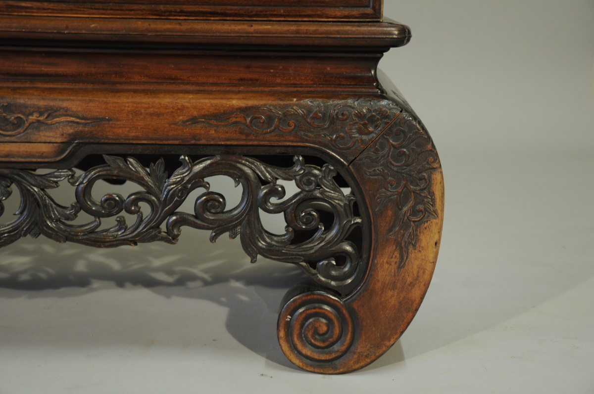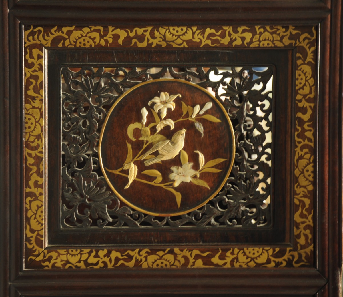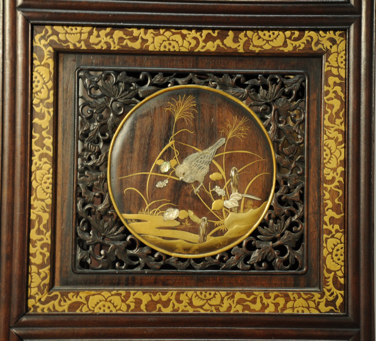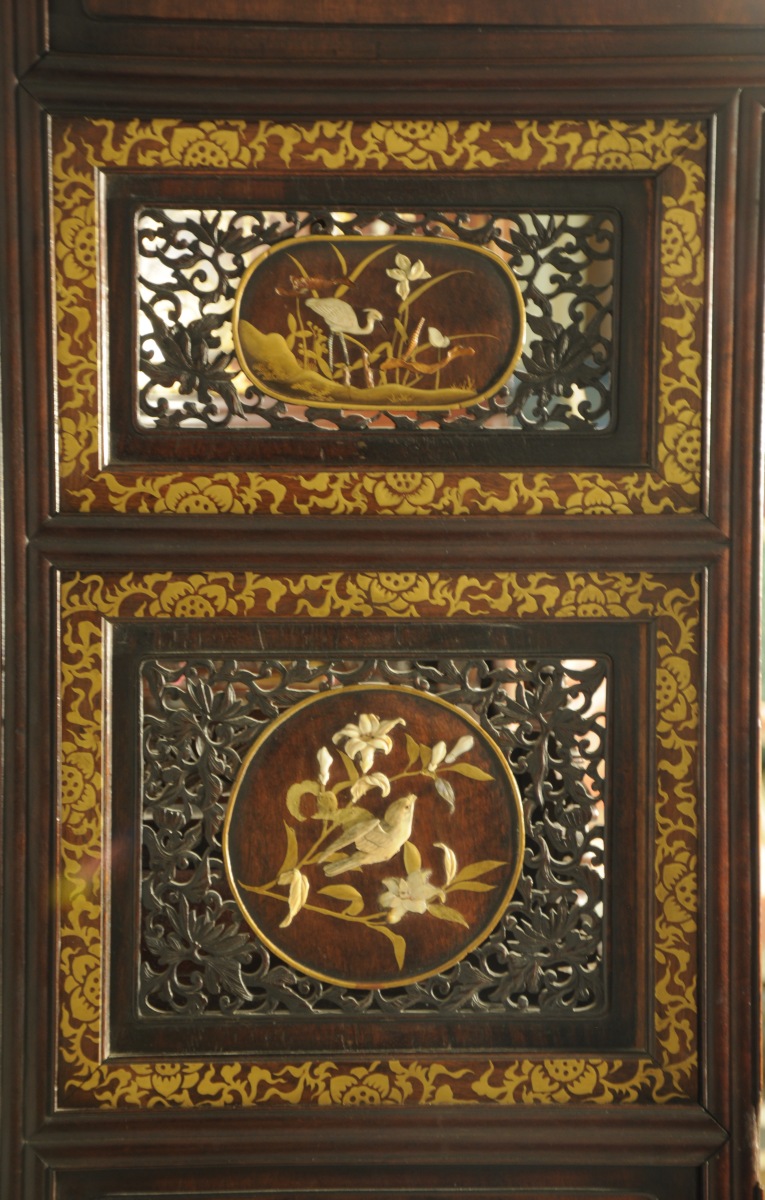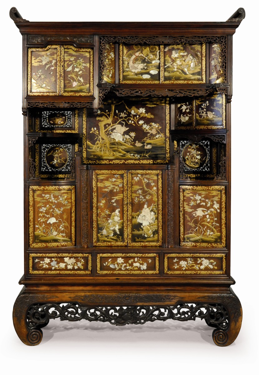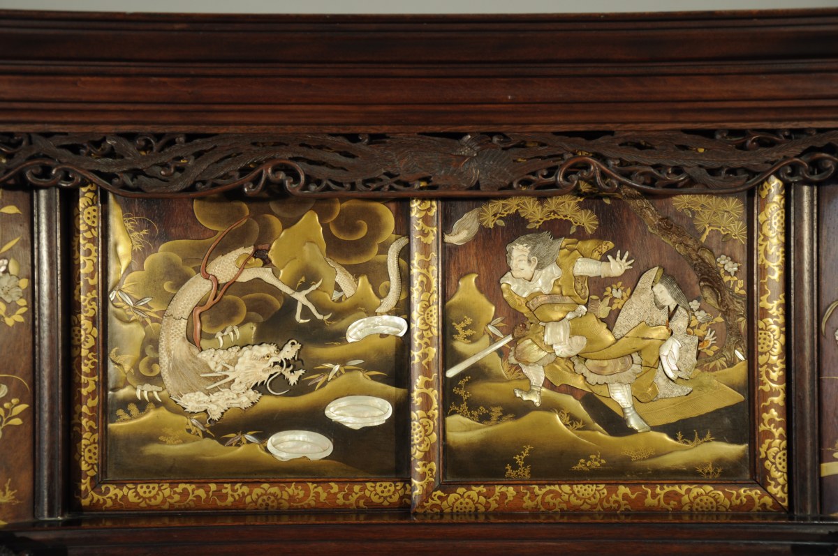 CABINET en bois exotique à compartiments ouvrant par des portes sur charnières ou coulissantes et par trois tiroirs en partie inférieure. Riche décor en incrustations de nacre et d'ivoire et à fond laqué or, figurant des scènes animées de chasse aux oiseaux et de combat contre un dragon, ainsi que des échassiers et des cailles dans des végétations. Motifs sculptés de feuilles, fleurs, chiens de Fô et phénix. Piétement et corniche en volutes.