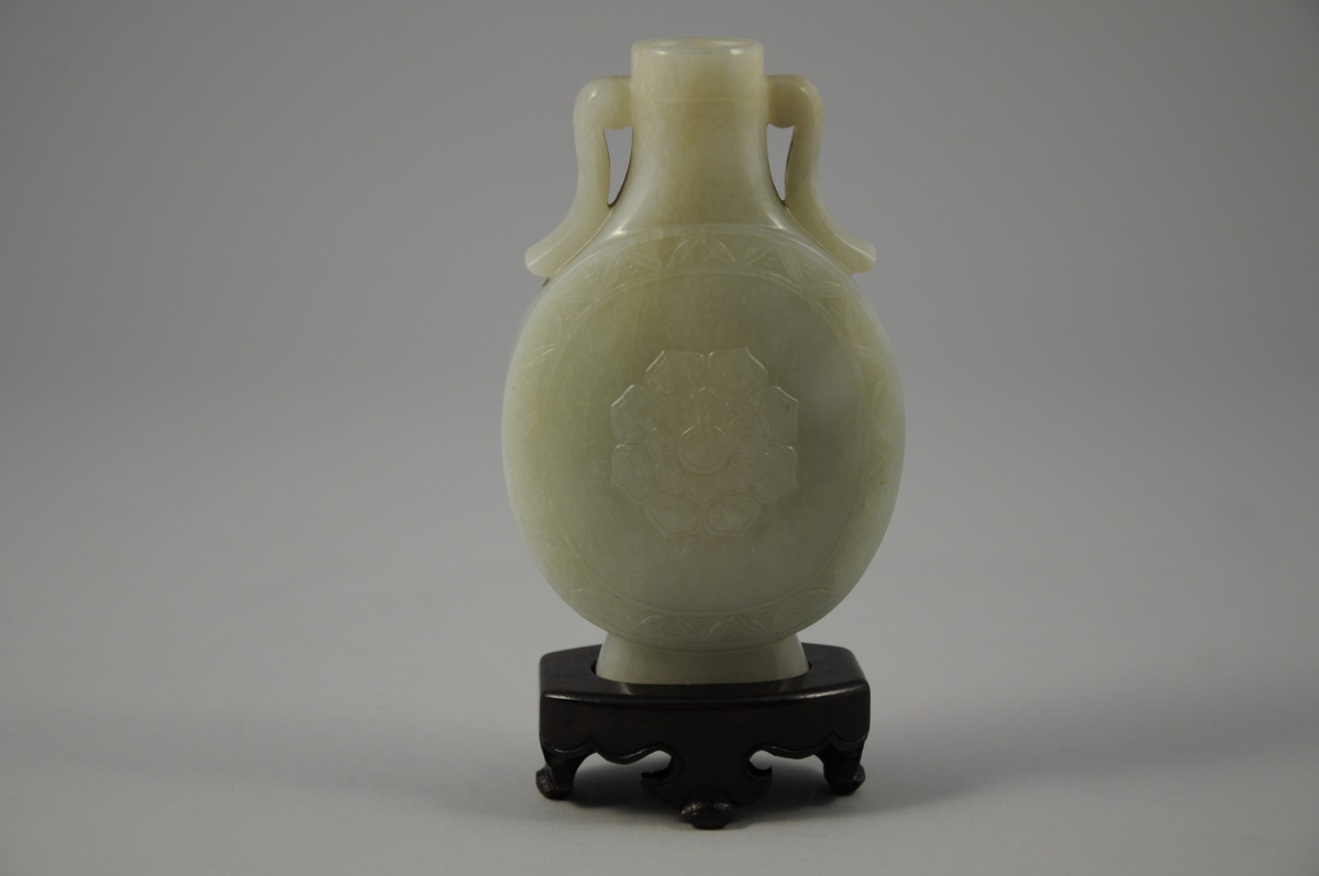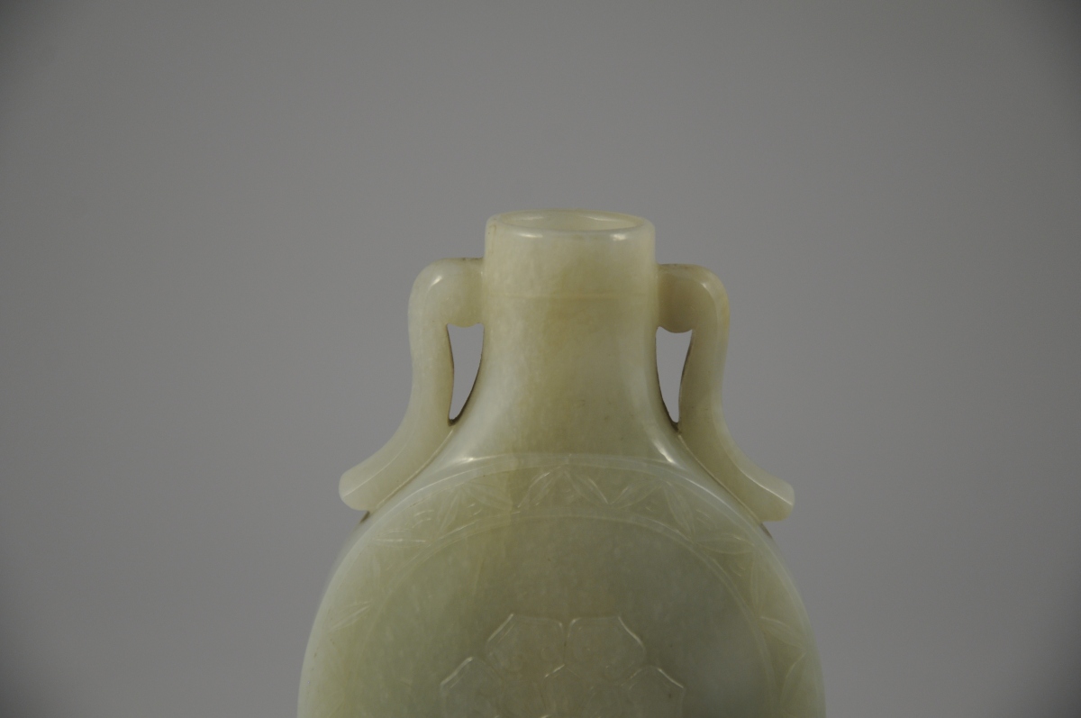 GOURDE " bianhu " balustre en néphrite céladon à deux anses, à décor gravé sur chaque côté d'une fleur de lotus stylisée, entouré d'une frise de motifs géométriques.