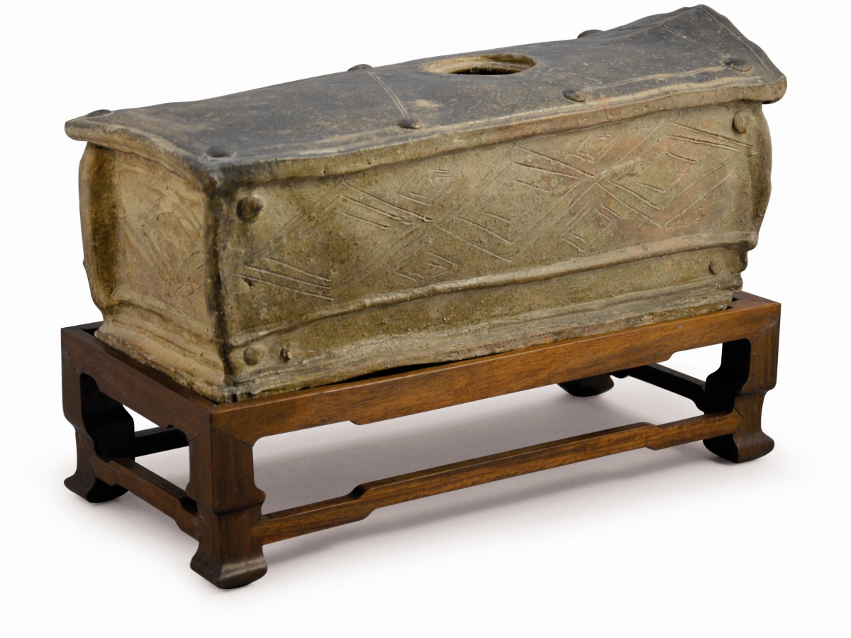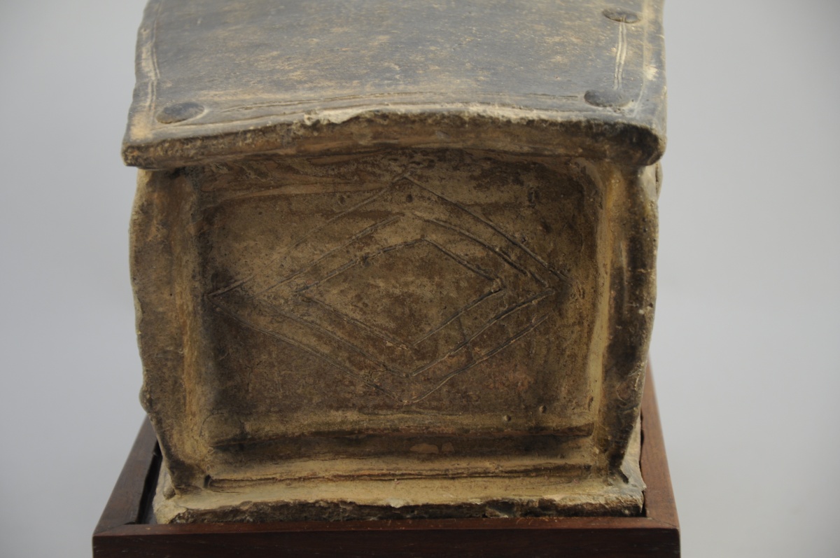 URNE FUNÉRAIRE en terre cuite à traces d'engobe rouge à décor de cercles concentriques, sur un socle en bois.
