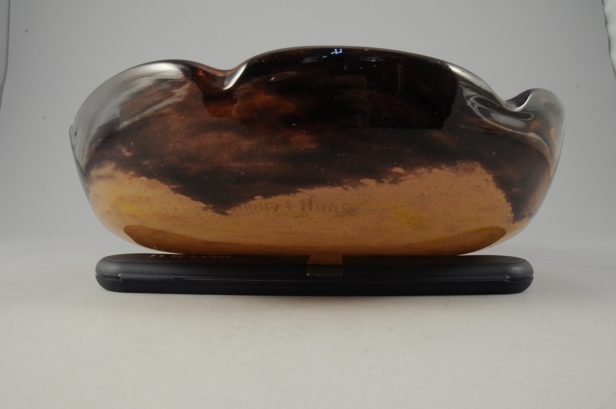 Large COUPE à bords mouvementés en verre multicouches dans les tons prune, attaqué à l'acide et rehaussé à l'or. Signée DAUM NANCY à la croix de Lorraine.