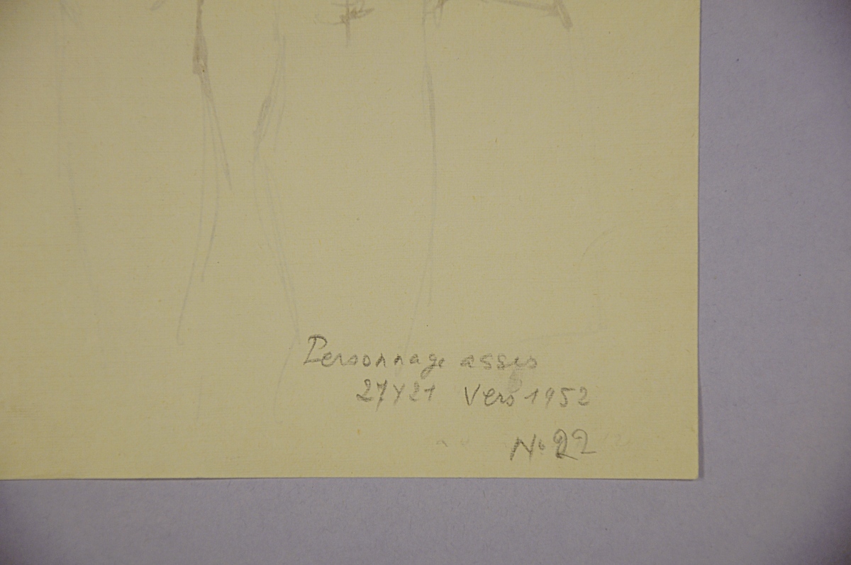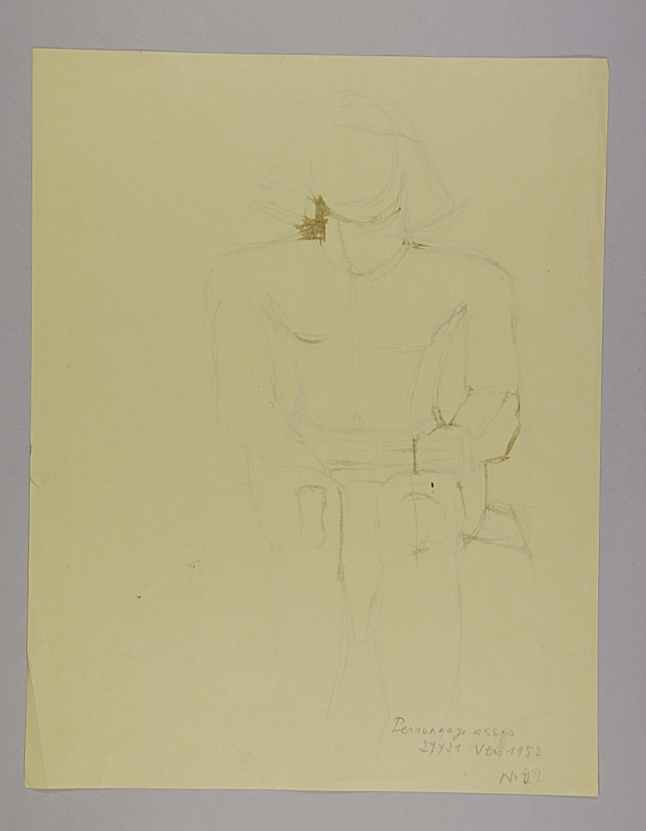 Mentions manuscrites au crayon au dos en bas : "Personnage assis / 27 x 21 vers 1952 / N° 22".