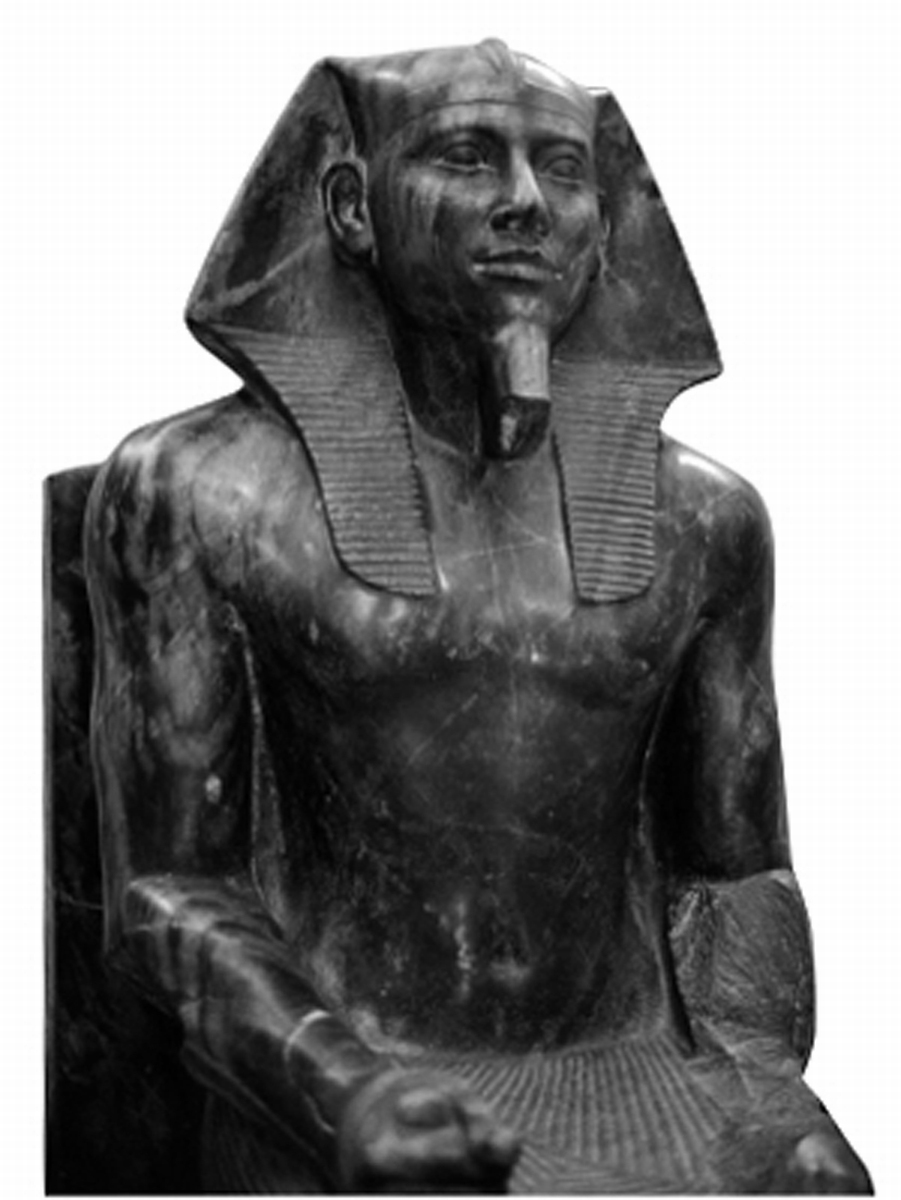 Peut-être la statue du Roi Khafre (Khephren) assis conservée au musée du Caire (Roi Khafre assis, diorite, vers 2540 à 2520 avant J.-C.) ou la statue de Maïa assis conservée au musée égyptien de Berlin (Maïa assis, vers 1.450 av J.-C.) ( ?)