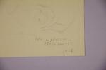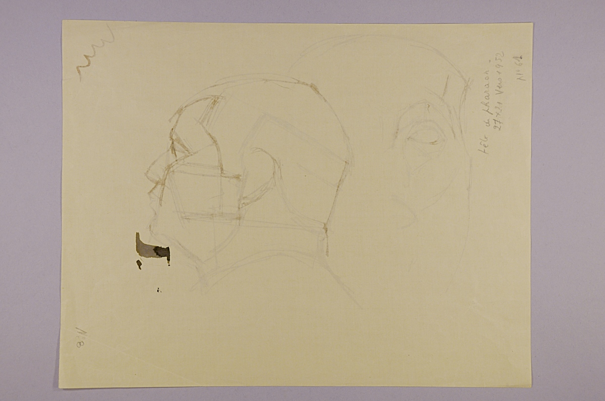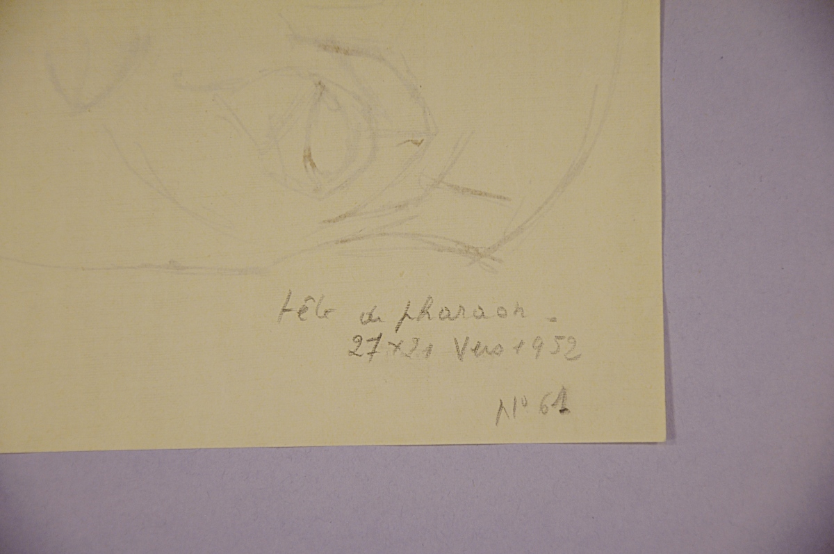 Mentions manuscrites au crayon au dos : en haut : "N°8", en bas : "tête de pharaon. / 27 x 21 Vers 1952 / N°61".