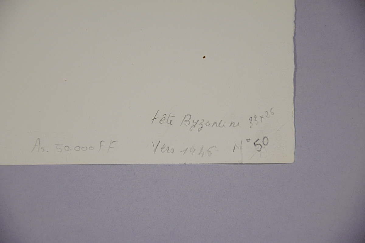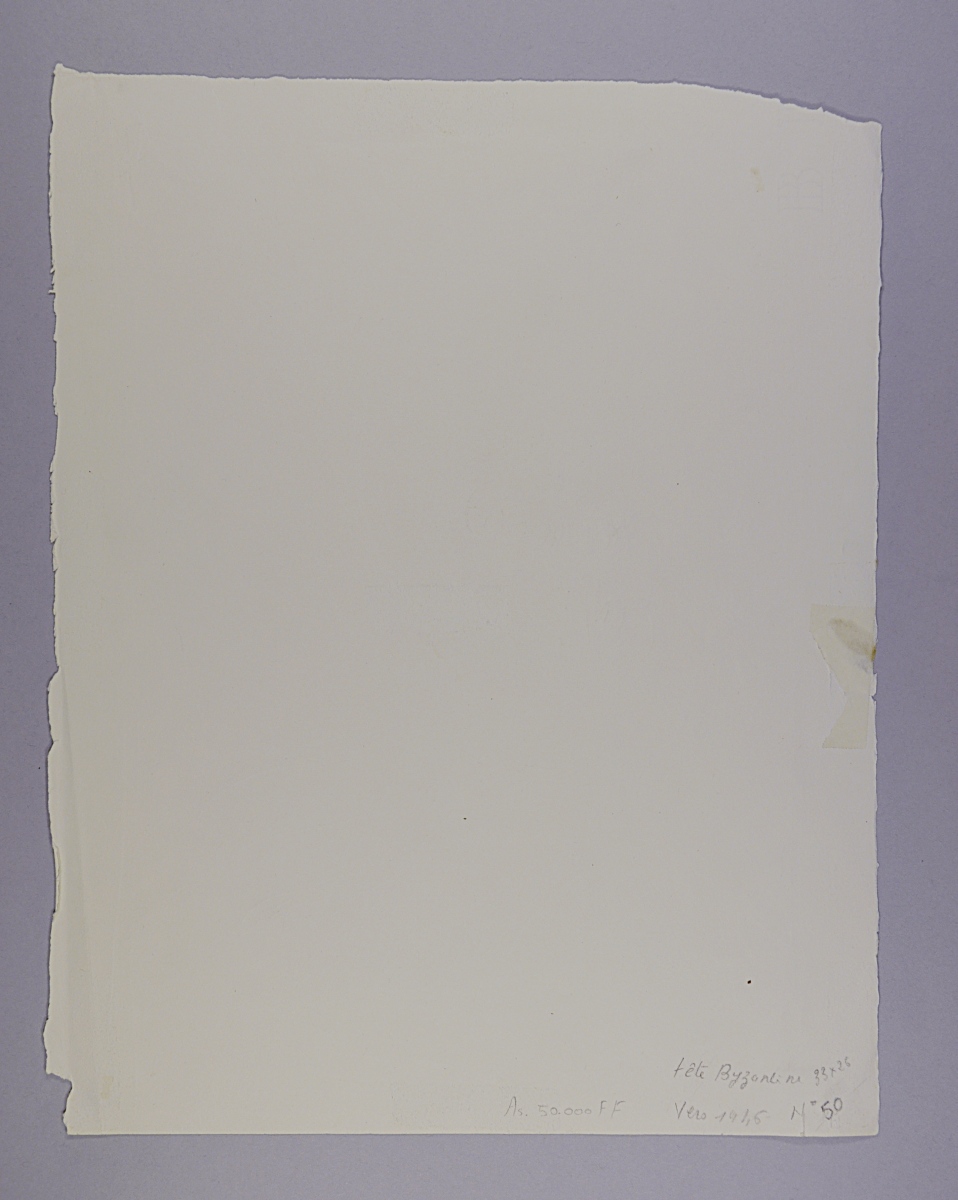 Mentions manuscrites au crayon au dos : en haut : "7", en bas : "Tête Byzantine / 33 x 26 / Vers 1946 / N°50 / As. 50.000 FF".