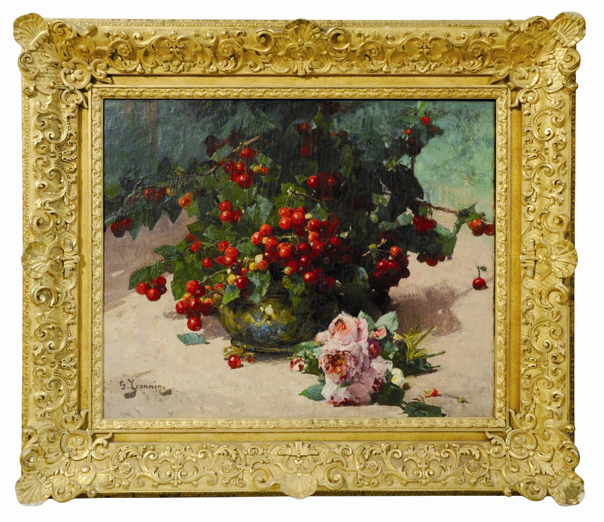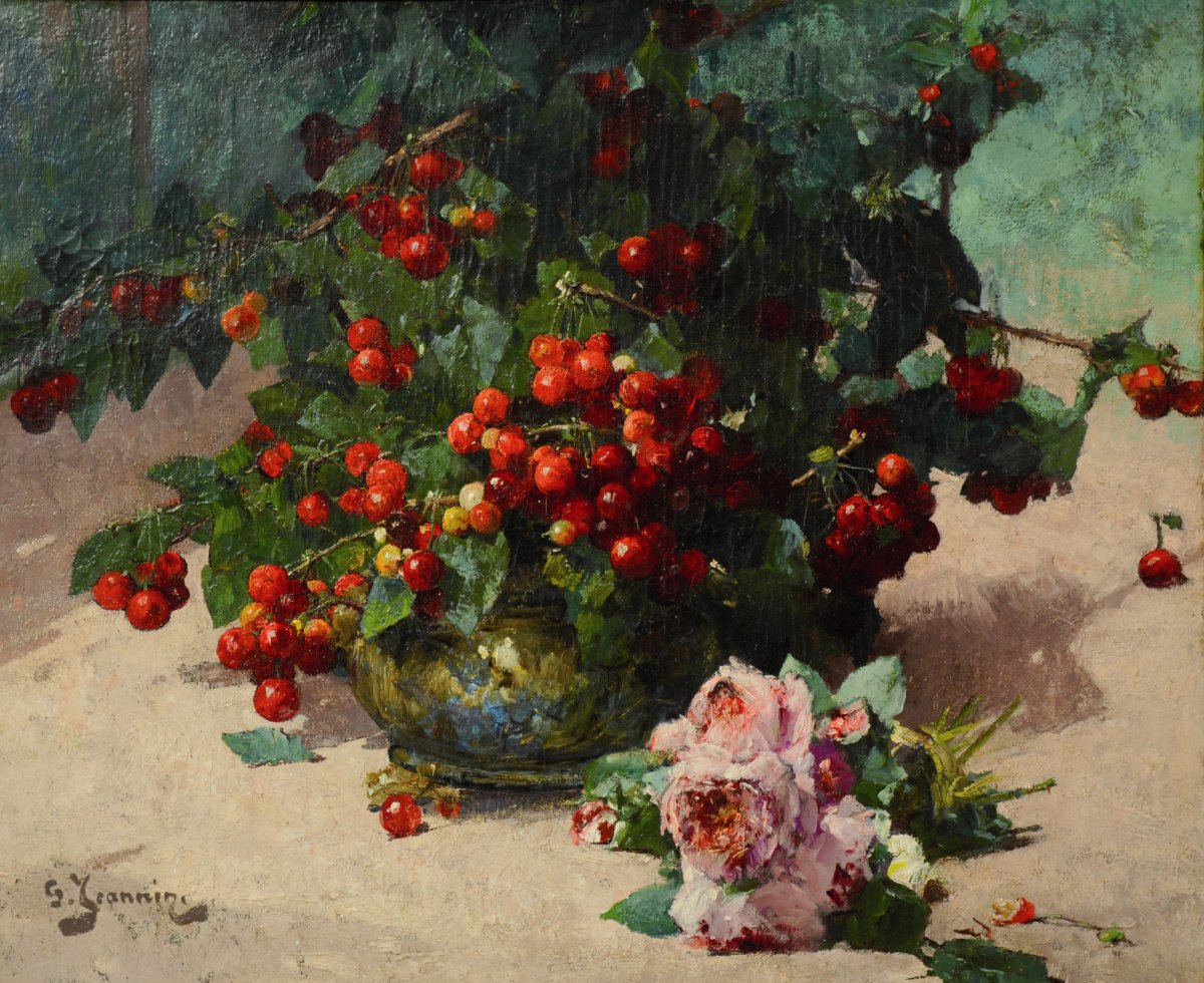 Georges JEANNIN (Paris, 1841 - 1925)Bouquet de cerises aux pivoines.Toile...