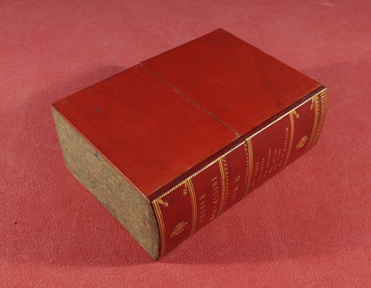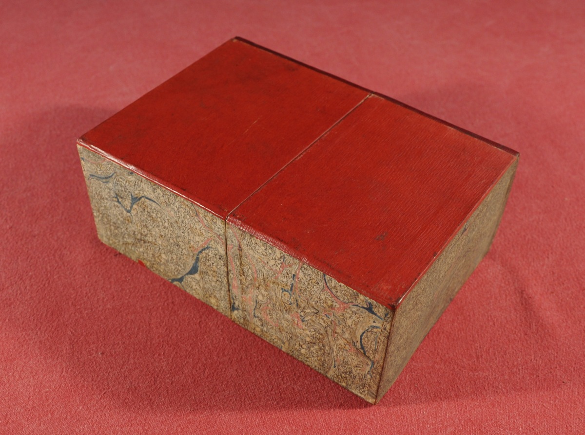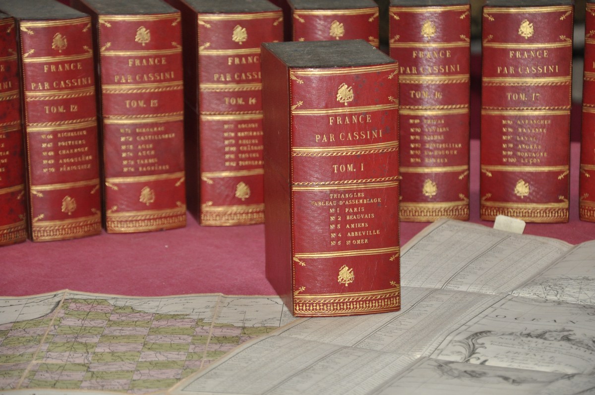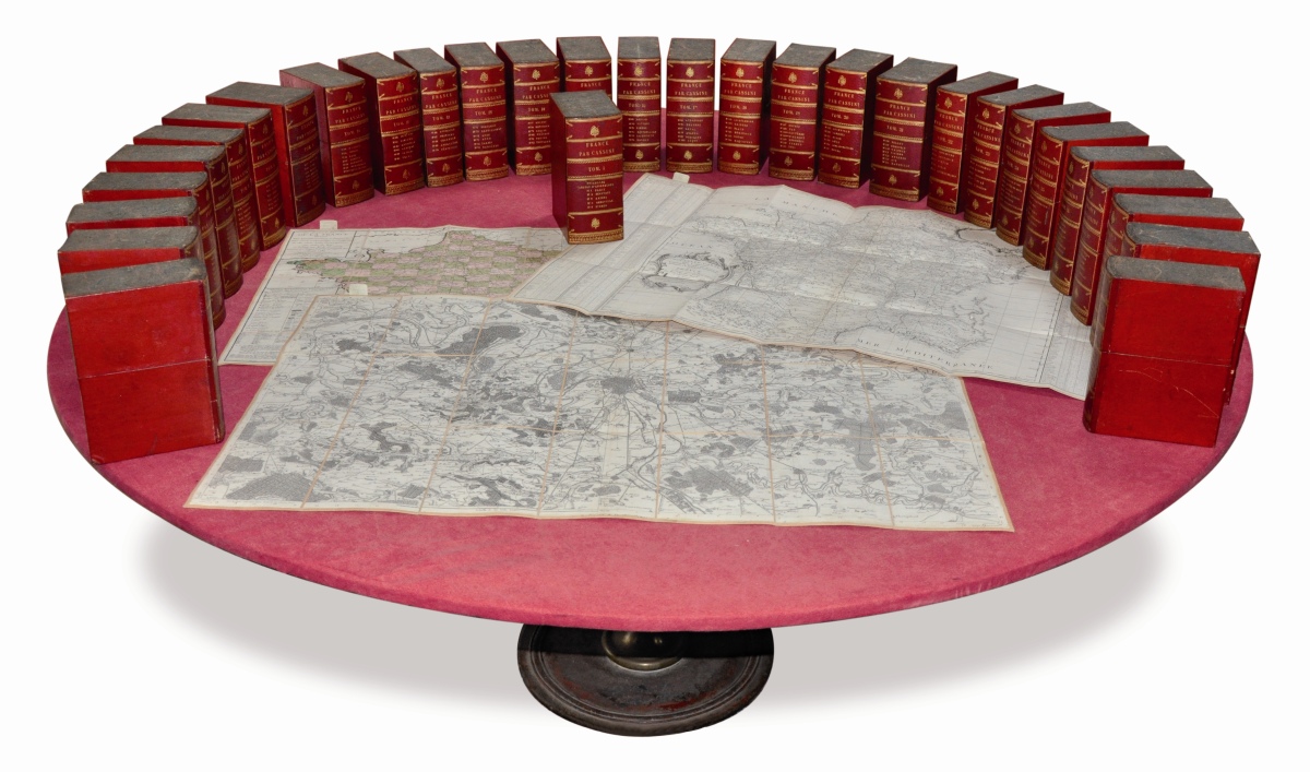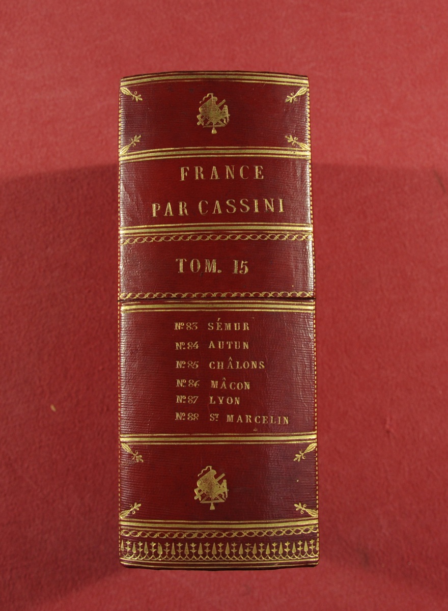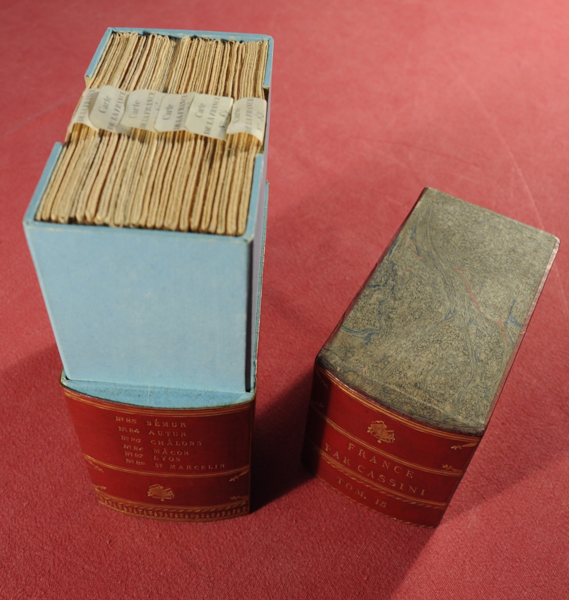 185 cartes en 30 boîtes in-4 (21,5 x 15,5 cm). En maroquin rouge : dos orné de dentelles et fleurons dorés avec titre "FRANCE PAR CASSINI", tomaison et liste des cartes en lettres dorées. Emboîtage papier rouge.