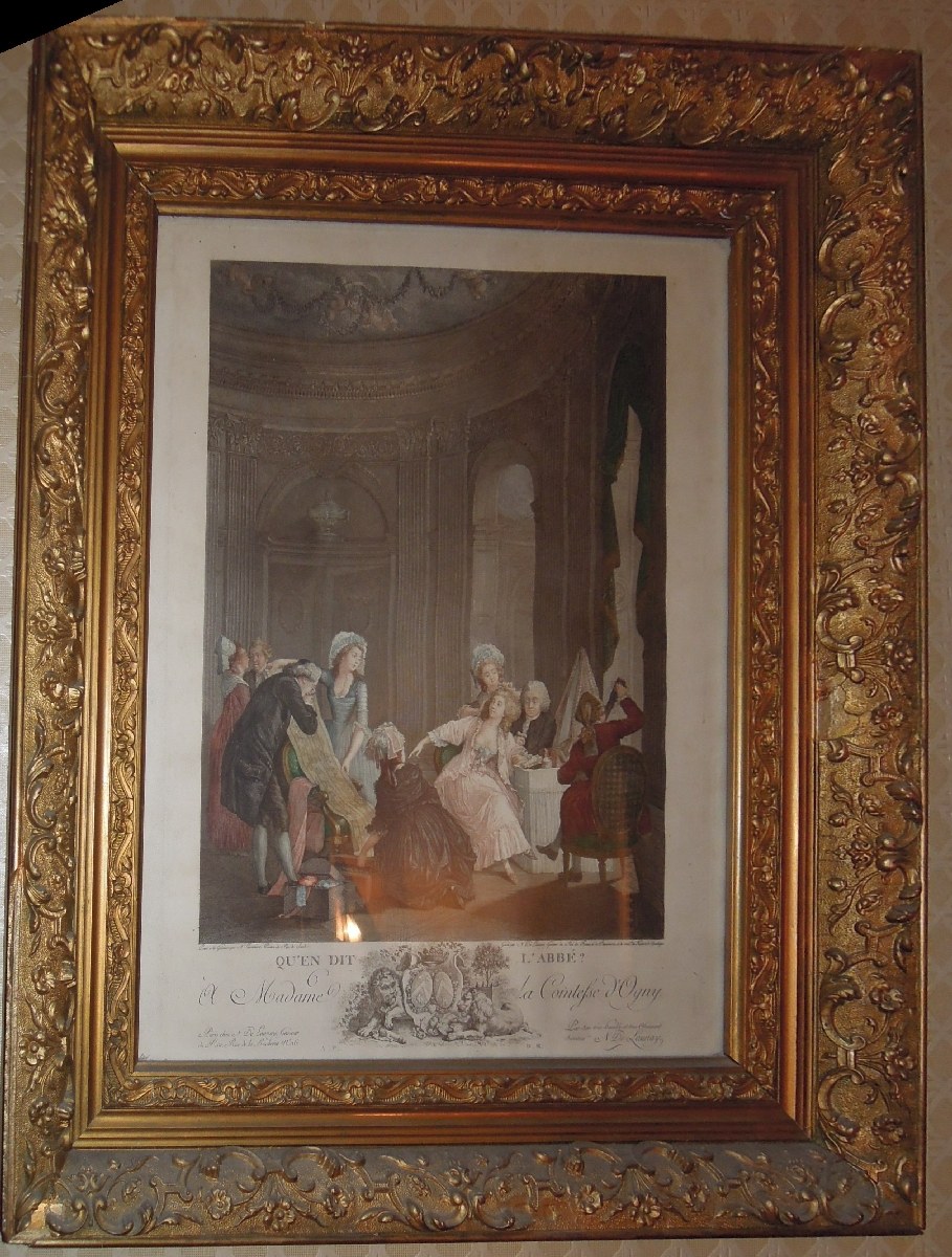 "QU'EN DIT L'ABBE ?" Gravure ancienne réhaussée en couleur dédiée à la Comtesse d'Oigny.