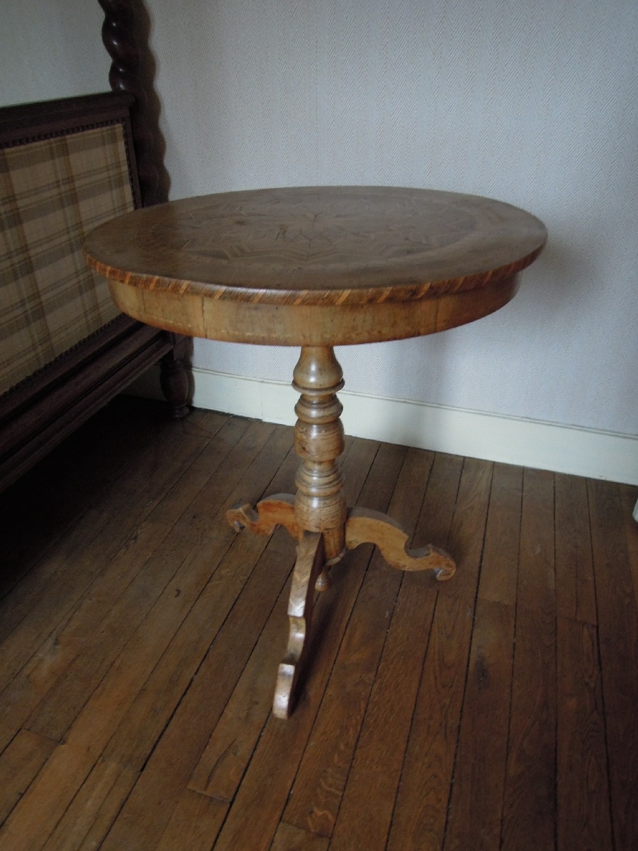 GUÉRIDON tripode au plateau circulaire marquetté d'une étoile rayonnaite géométrisée. XIXème siècle. Hauteur 73, Diamètre du plateau 60 cm.