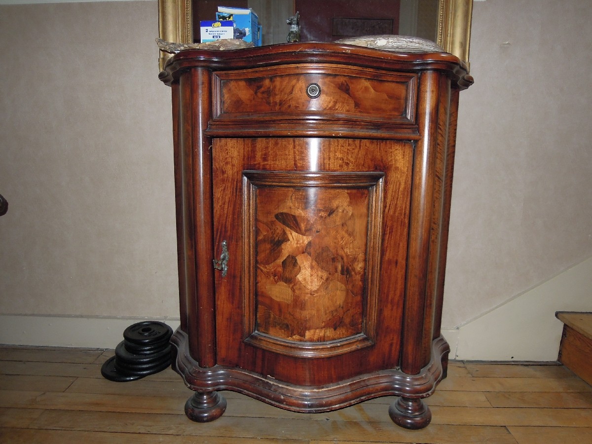 MEUBLE D'ENTRE DEUX à façade arbalète en acajou mouluré ouvrant à un tiroir et une porte, galbé toutes faces, les pieds antérieurs en toupie inversée. Travail portuaire ancien. Nantes (?) Hauteur 91, Largeur 87, Profondeur 40 cm.
