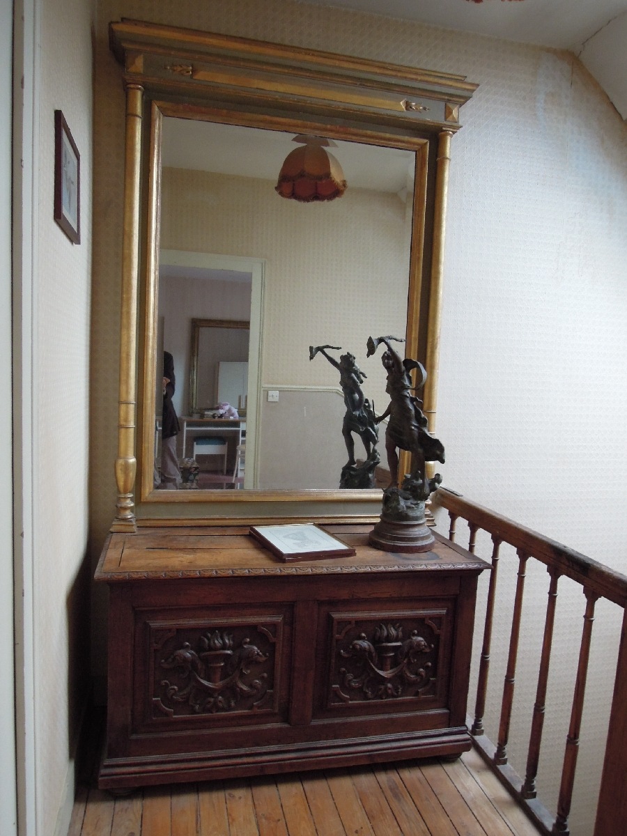 Grand MIROIR en bois sculpté, doré et renchampi vert 'eau, les montants en colonnes détachées réunies par un linteau ouvragé.
