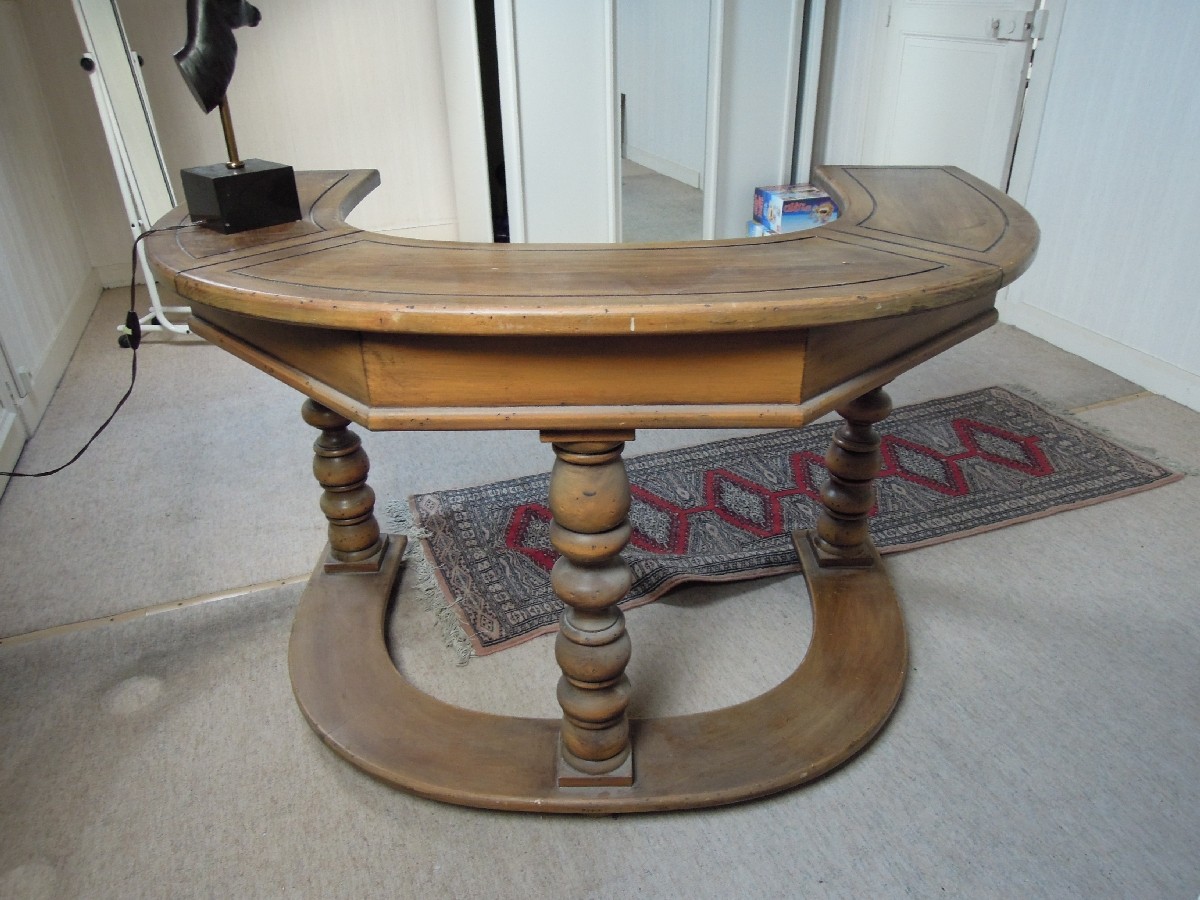BUREAU SEMI-CIRCULAIRE en bois naturel mouluré, foncé d'un maroquin et agréémenté d'un comptoir, reposant sur trois colonnes chapelet réunies par une entretoise semi-circulaire. XXème siècle.