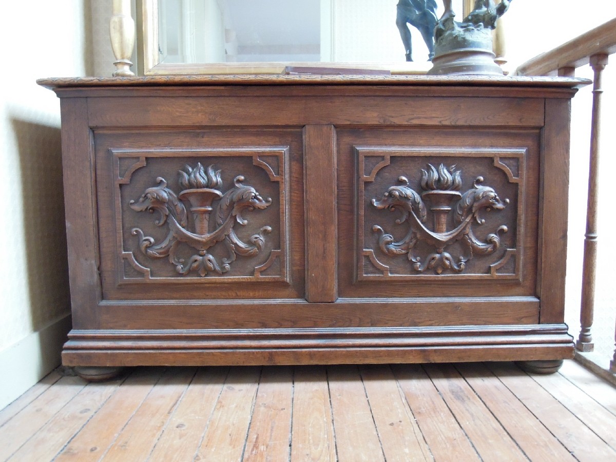 Important COFFRE en bois naturel mouluré et sculpté de dauphins, reposant sur quate petits pieds applatis.