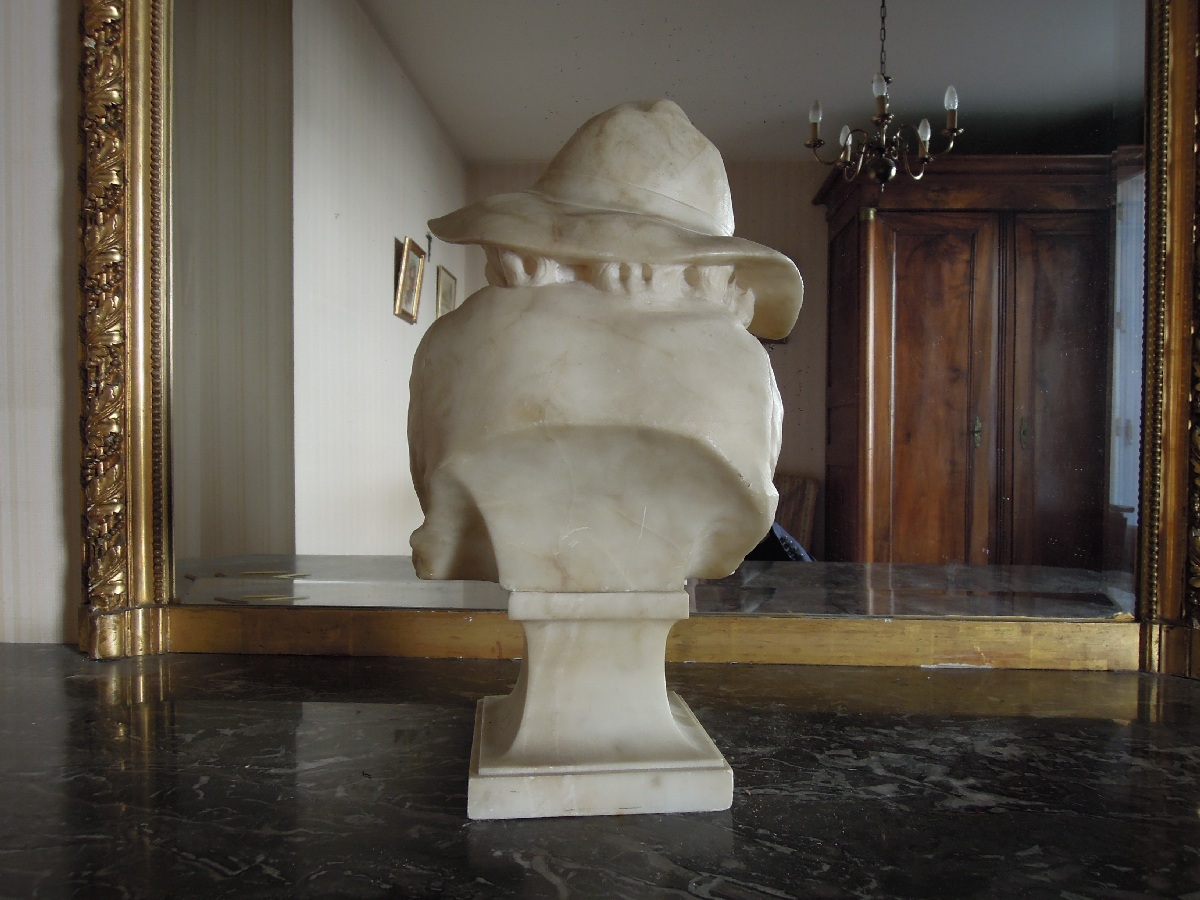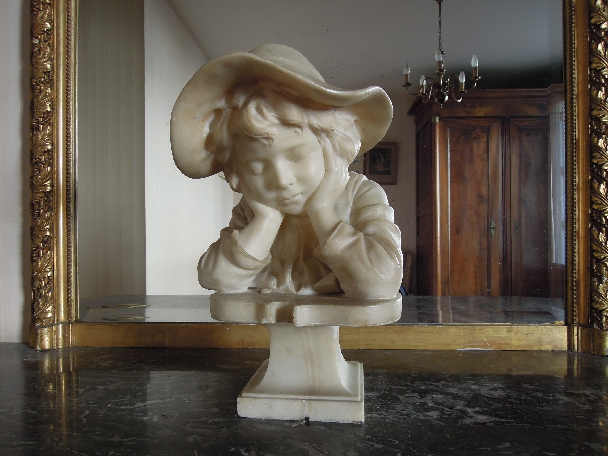 M VITI. Écolier endormi. Groupe en albatre sculpté sur son socle signé. Hauteur totale 38 cm (accidents)