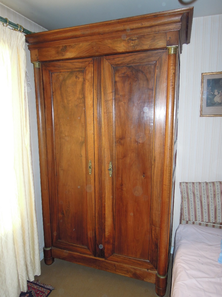 Belle ARMOIRE en noyer blond, ouvrant à deux portes encadrées par des colonnes détachées, corniche droite, Première moitié du XIXème siècle. Hauteur 230, Largeur 127, Profondeur 64 cm.