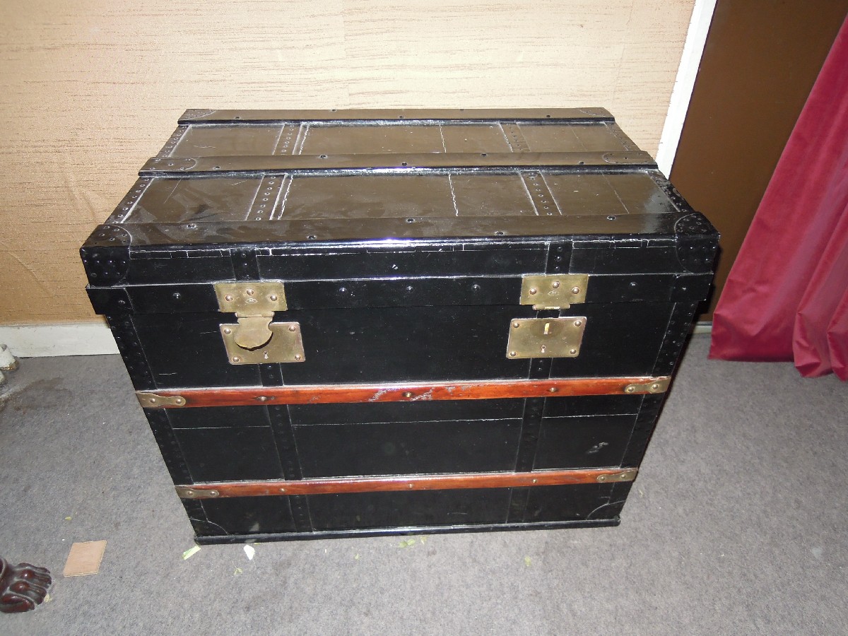 COFFRE de VOITURE en bois laqué noir, renfort et serrures en laiton. Hauteur 61, Largeur 76, Profondeur 47 cm.