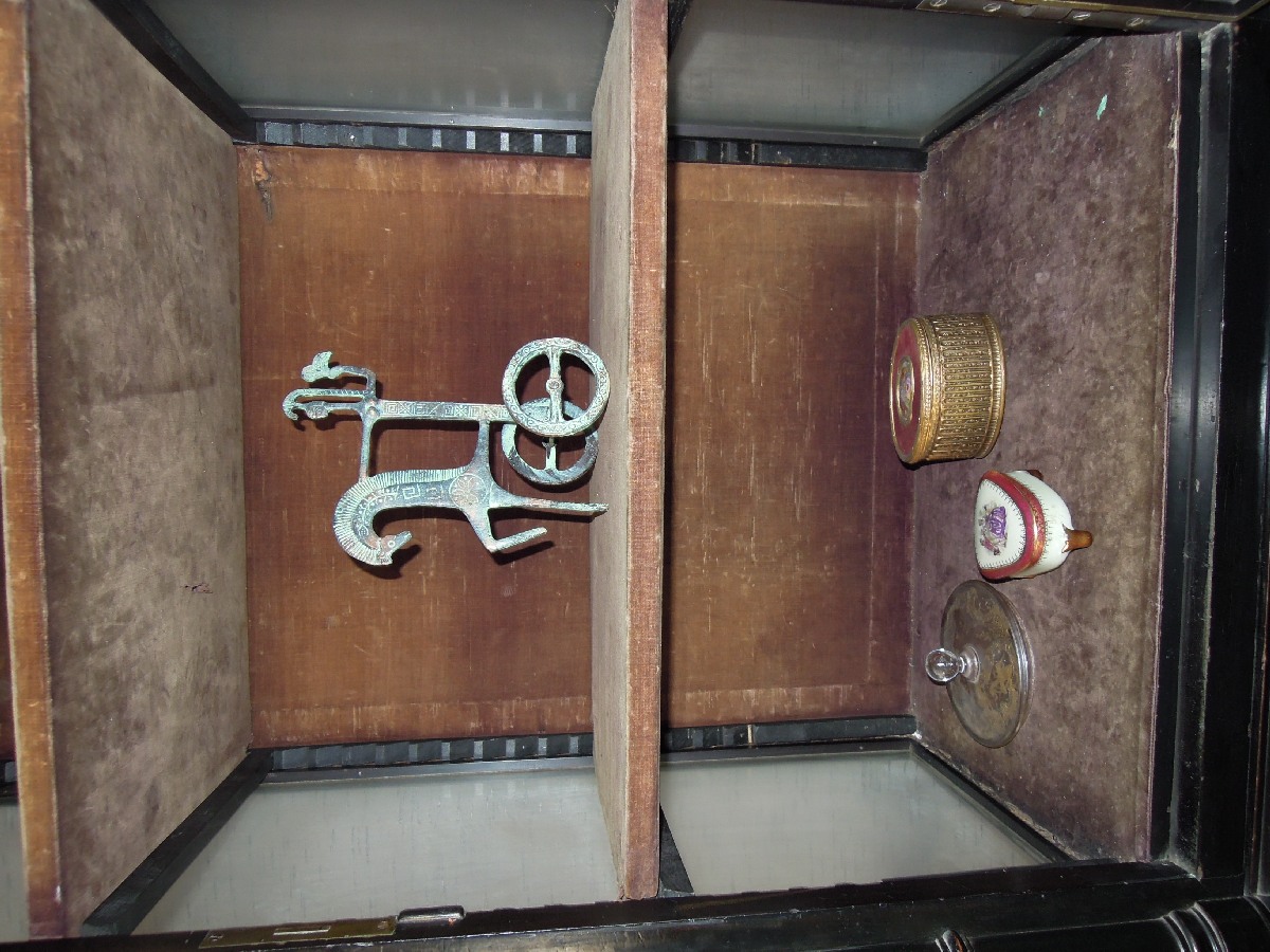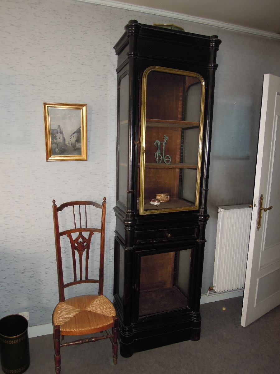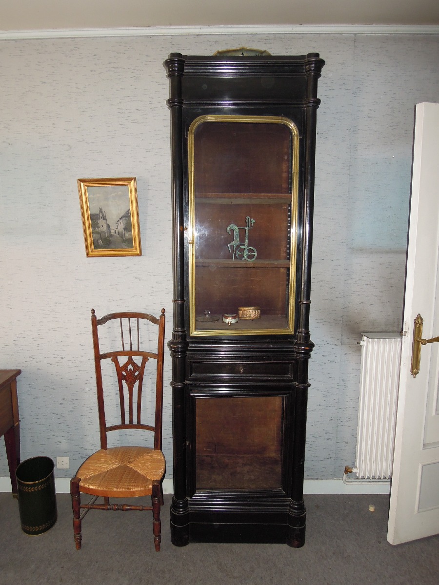 Haute VITRINE a deux corps en bois mouluré et noircçi ouvrant à deux portes vitrées et un tirois, les côtés également vitrés.
