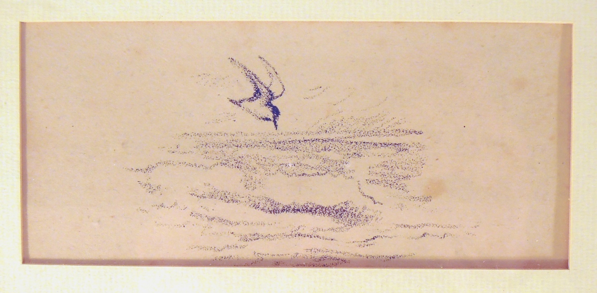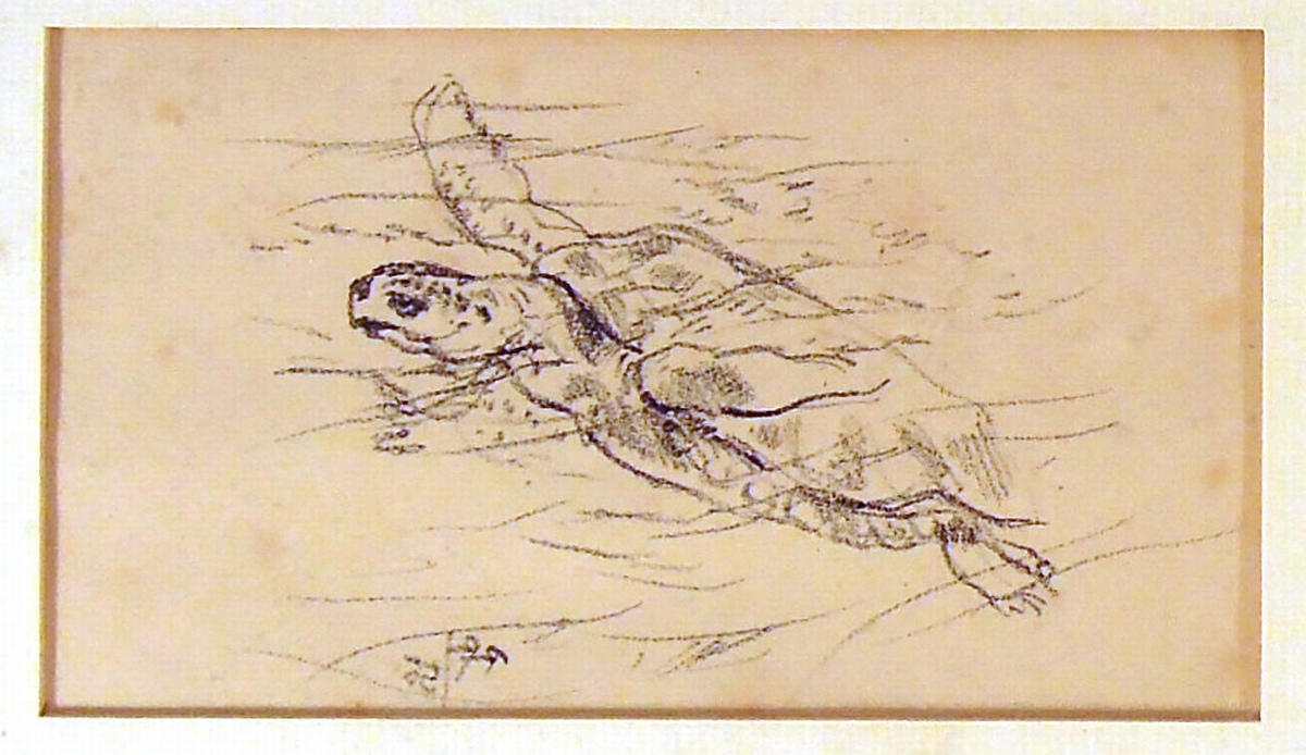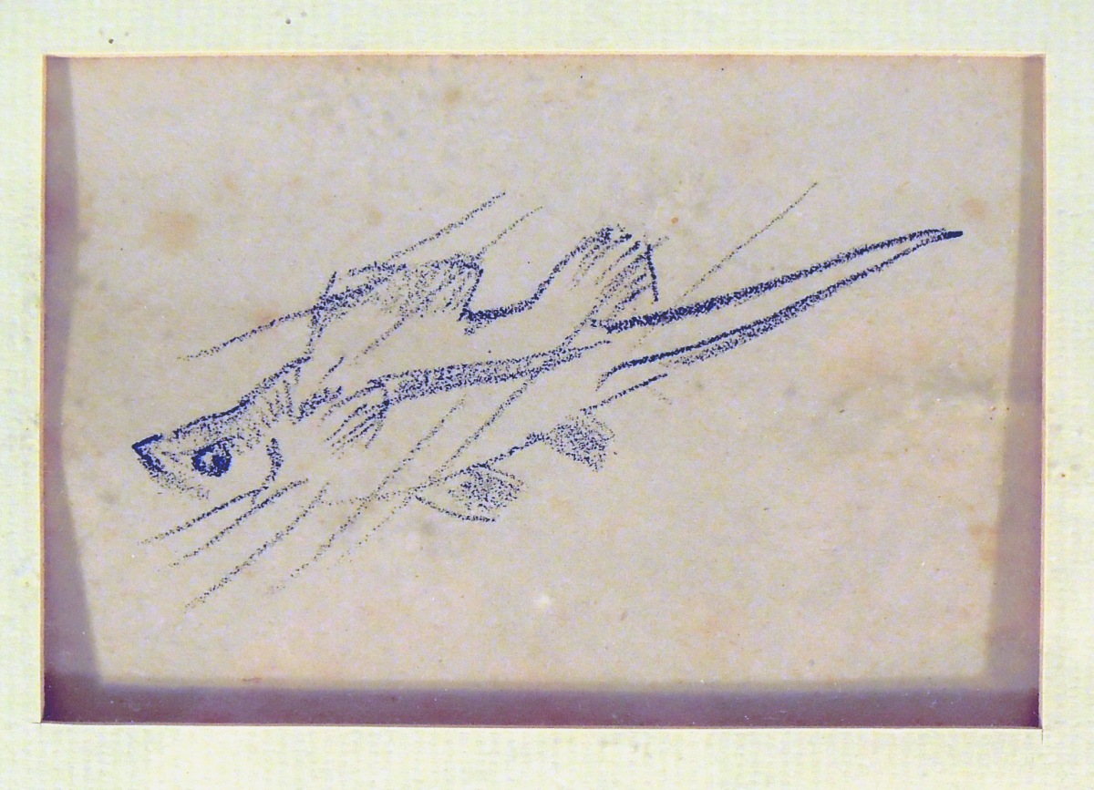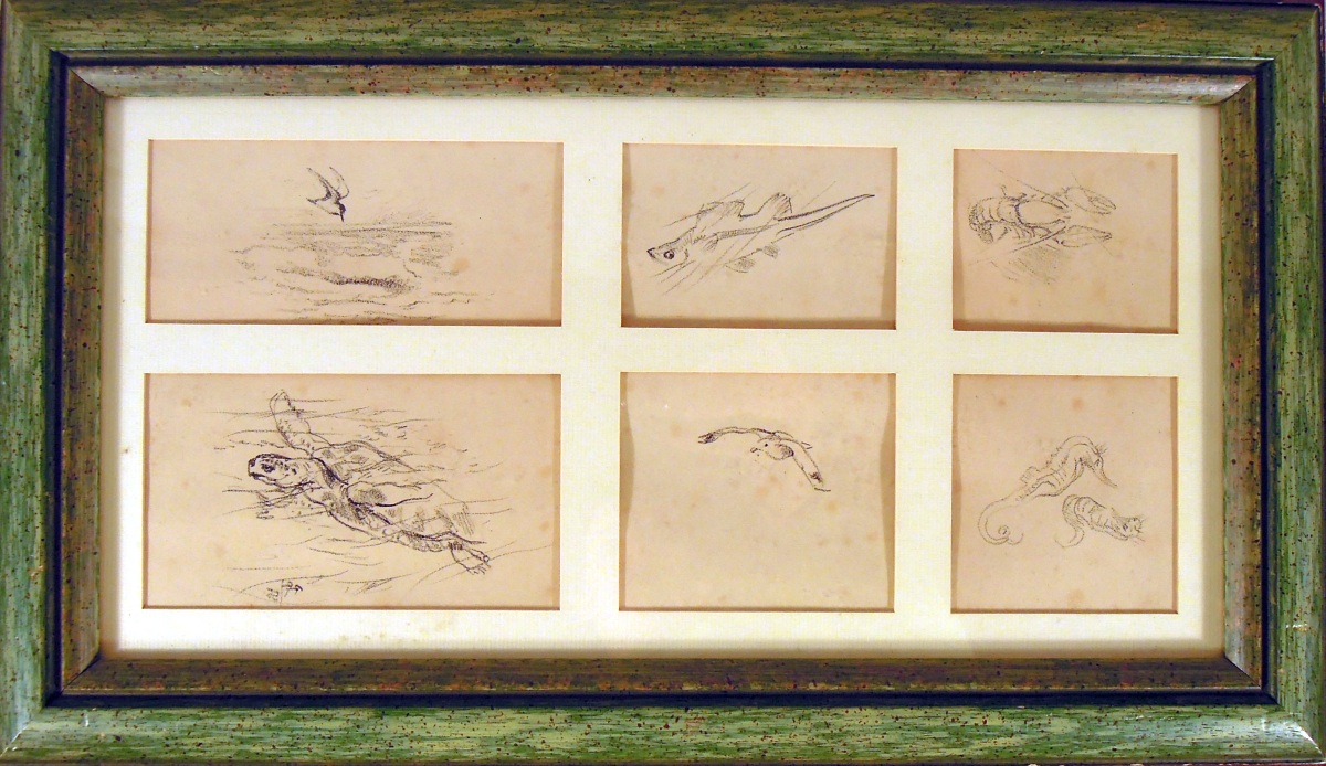 Animaux marins. 6 oeuvres au crayon lithographique : tortue, homard, goëland, hippocampe, poisson et sterne, réunis dans un encadrement de 15,5 x 34,5 cm..