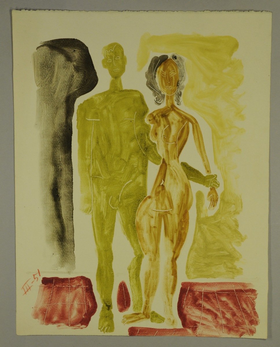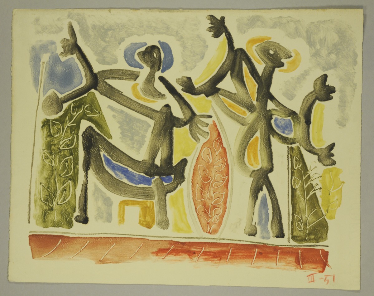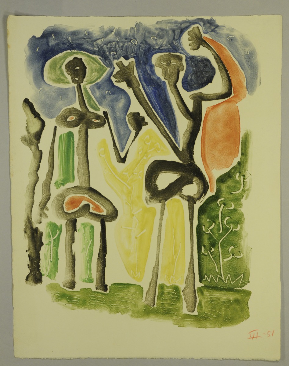 Quatre aquarelles travaillées au couteau sur papier. Trois d'entre elles numérotées "III-51" en bas à droite.