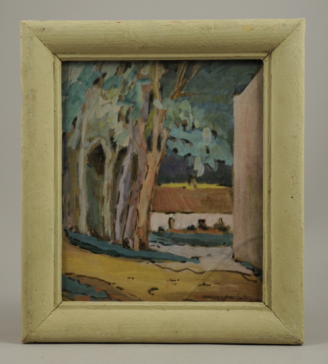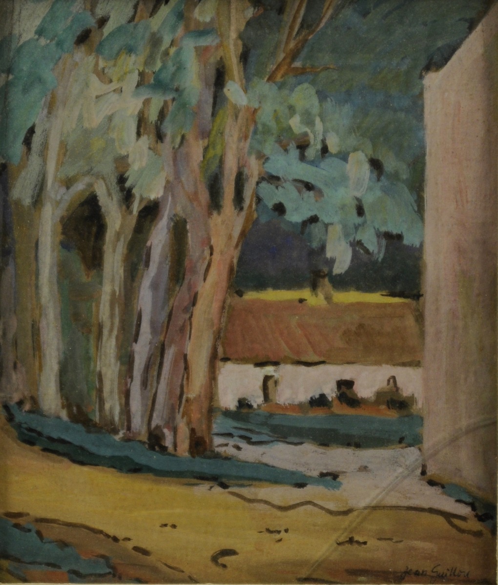 Jean GUILLOU (XXème).Maison en forêt.Gouache sur carton signée en bas...