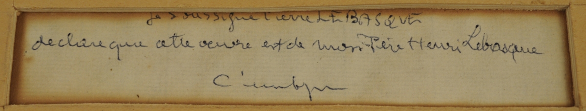 Le dos de la feuille porte la mention signée : "Je soussigné Pierre Lebasque déclare que cette oeuvre est de mon père Henri Lebasque".