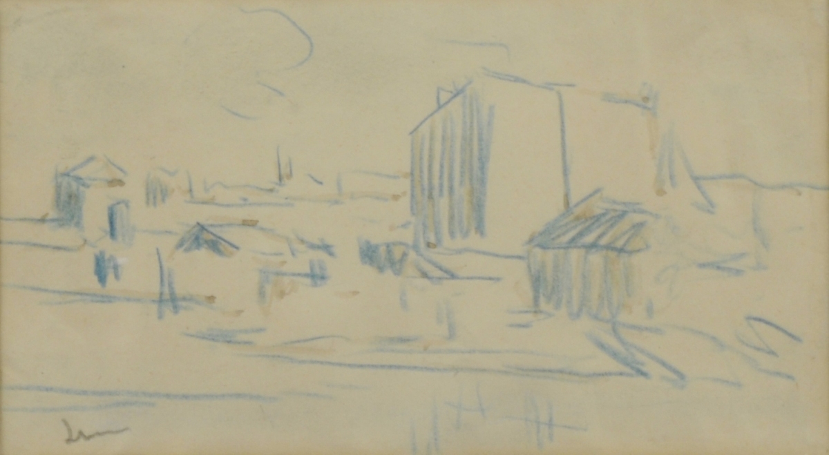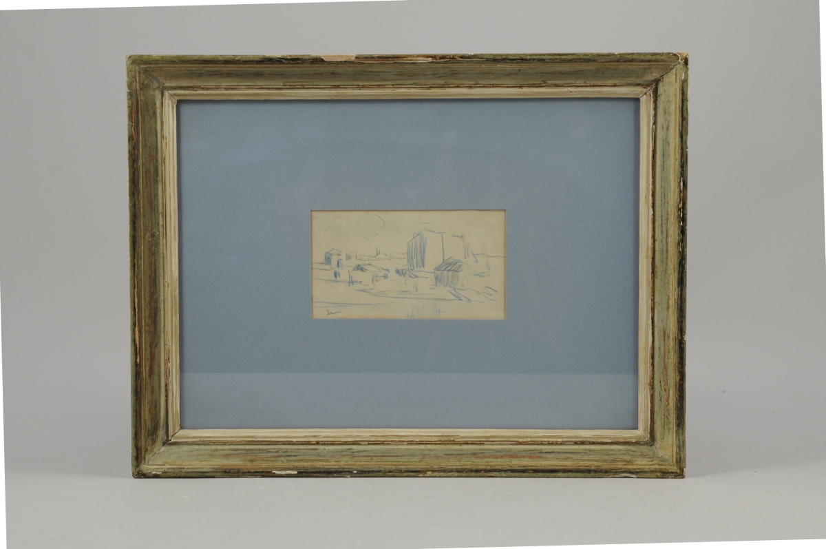 Dessin au crayon bleu et lavis d'encre signé en bas à gauche.