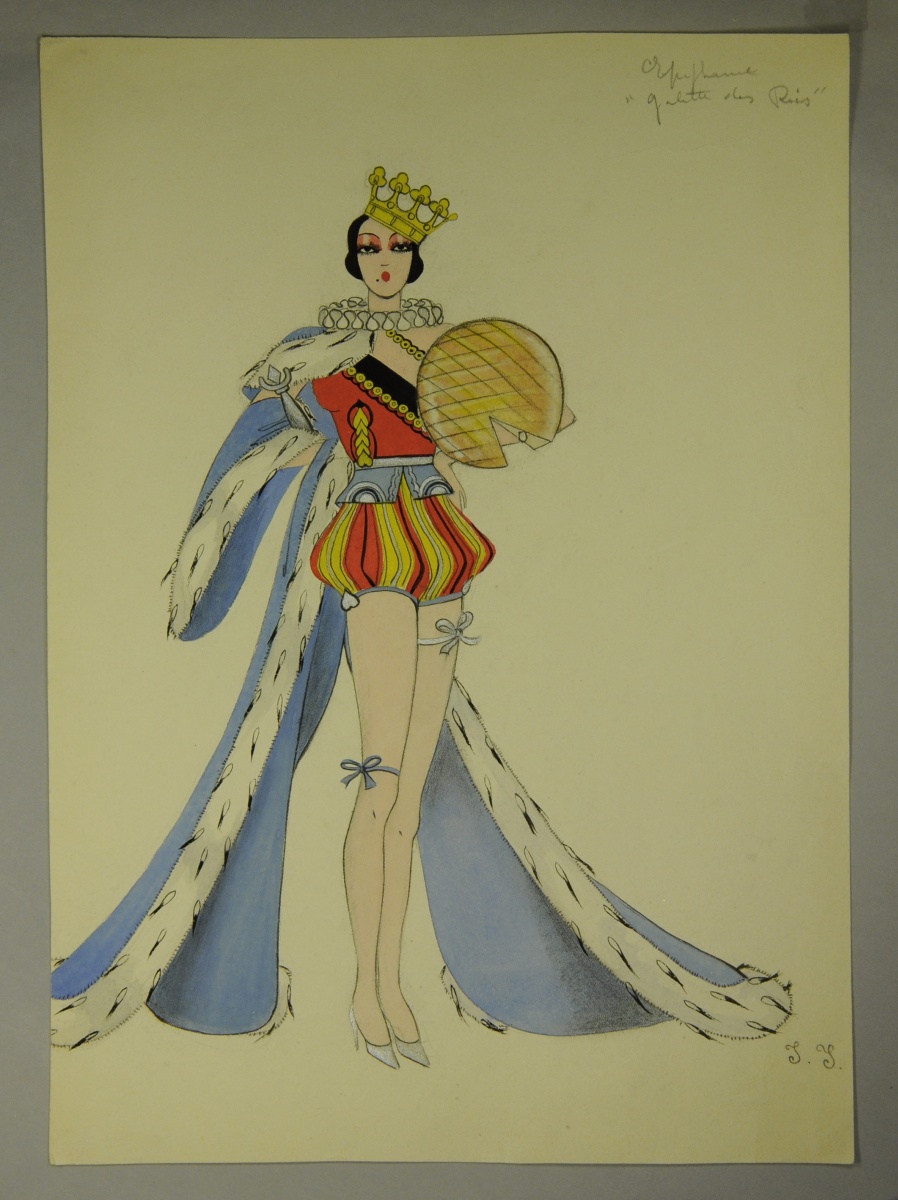Cinq dessins de MODE en couleurs sur le thème des fêtes. Milieu du XXème.
