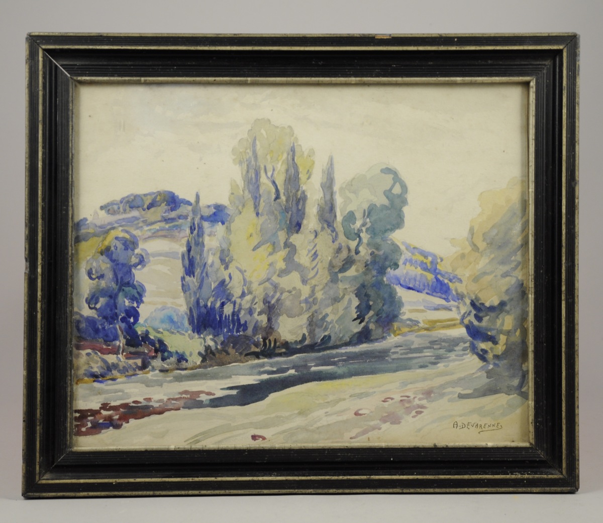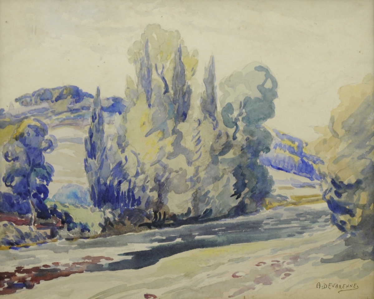 Anatole DEVARENNE (1880-1954).Colline et arbres au bord d'une rivière.Aquarelle signée...