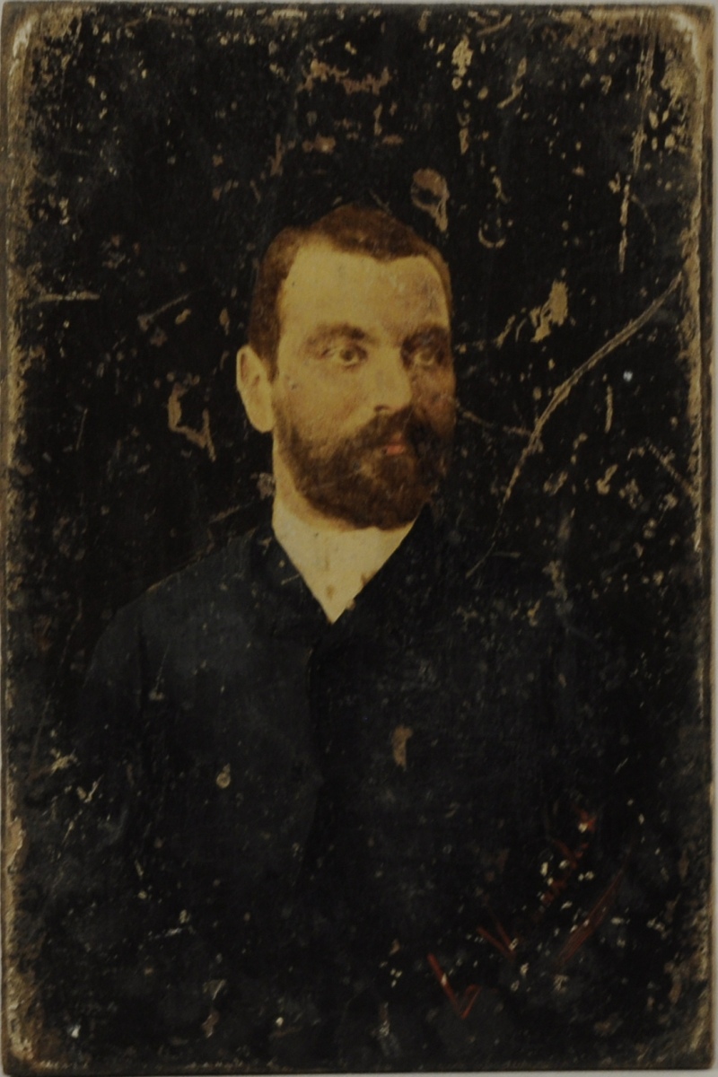 Panneau ovale figurant une vue d'église romane animée de personnages.