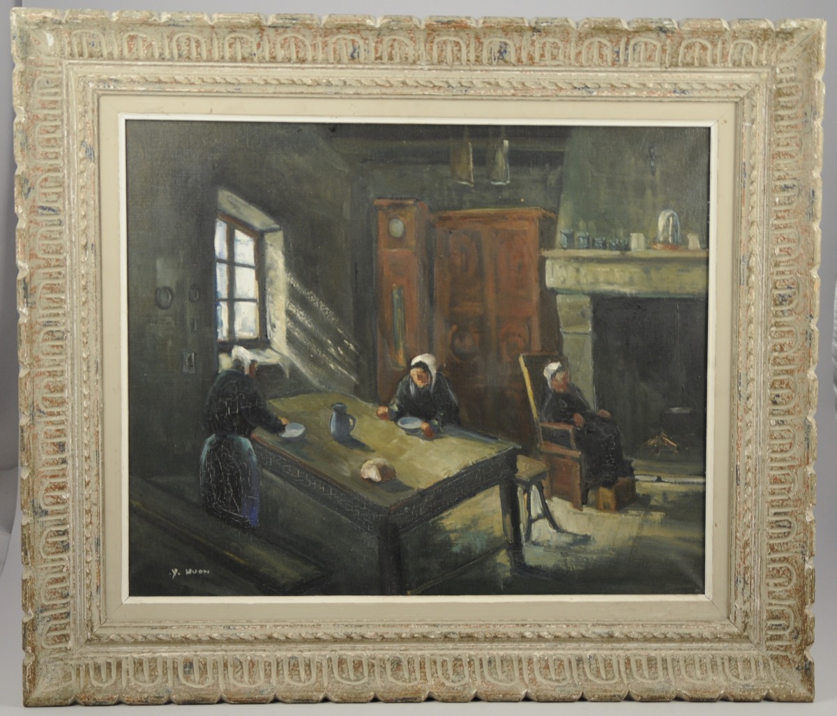 Y. HUON (XXème). Bretonnes dans un intérieur.Huile sur toile signée...