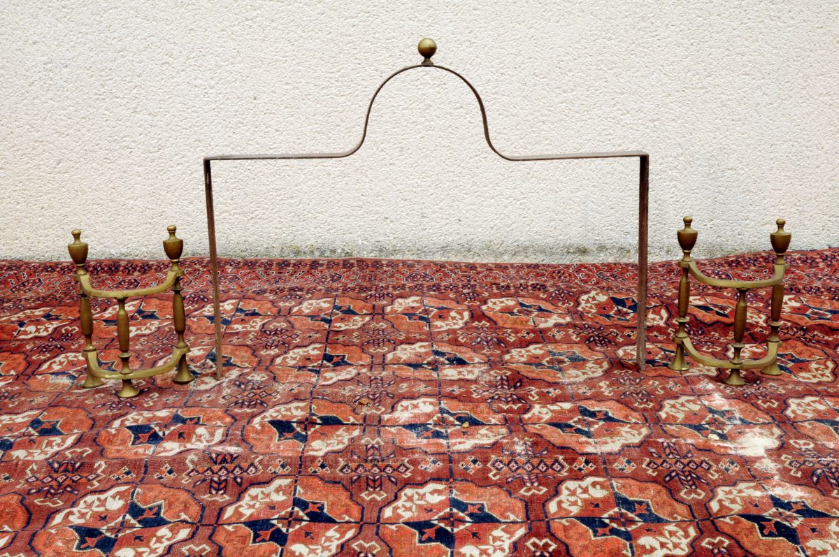 RESSERRE-BRAISES à ressaut central en fer et boulle de laiton. Fin XIXème - début XXème. Haut. 7, Larg. 72, Prof. 55 cm.