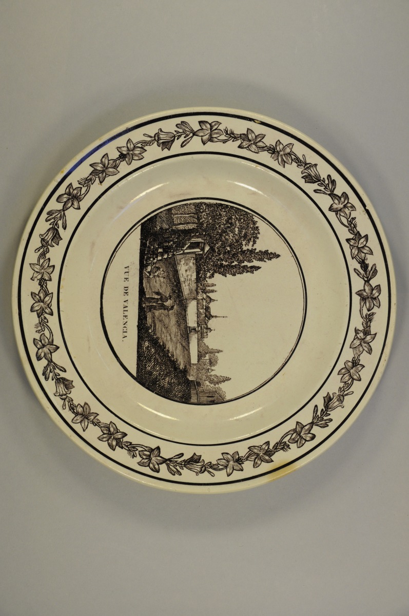 ASSIETTE en faïence fine à décor dans le bassin d'une vue de Valencia, animée de personnages. Aile de frise florale. XIXème. Diam. 24,5 cm (infime éclat)