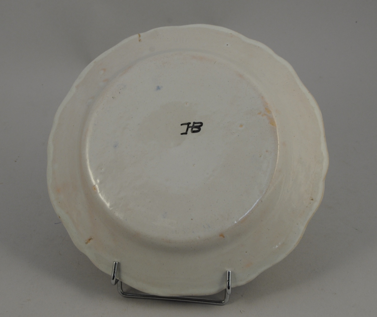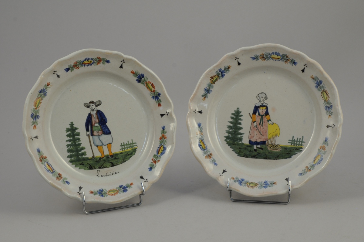 PAIRE D'ASSIETTES en faïence à bord contourné. Décor polychrome au centre dit "au petit breton" portant l'inscription "Landivisiau", pour l'une, et d'une bretonne. Décor de mouchetures d'hermine et bouquets de fleurs sur l'aile. Style de Quimper. Marque "HB". Diam. 23, 7 cm.