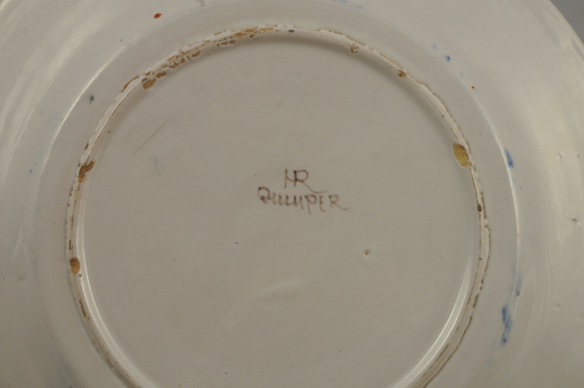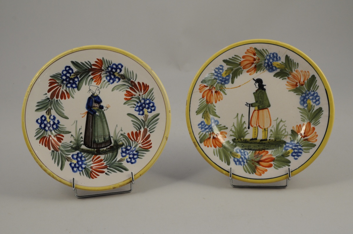 PAIRE D'ASSIETTES en faïence. Décor polychrome au centre dit "au petit breton", pour l'une, et d'une bretonne. Guirlande de fleurs circulaire sur l'aile et le marli, filets jaune et brun sur le bord. Style de Quimper. Marque "HR Quimper". Diam. 23, 7 cm. (accident, recollement et égrenures)
