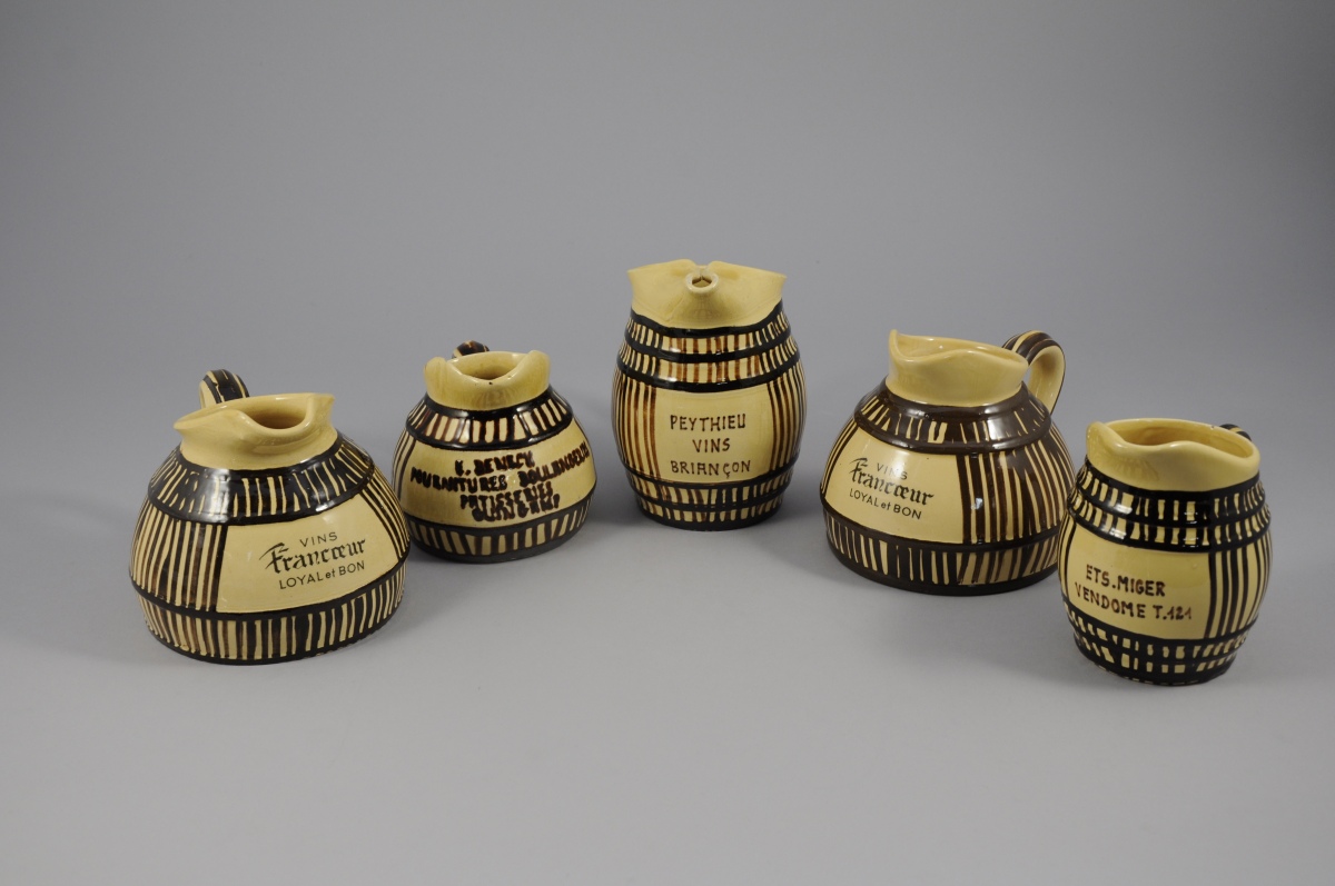 Réunion de cinq PICHETS PUBLICITAIRES en terre cuite vernissée, à décor strié brun sur fond jaune. Ils sont marqués :