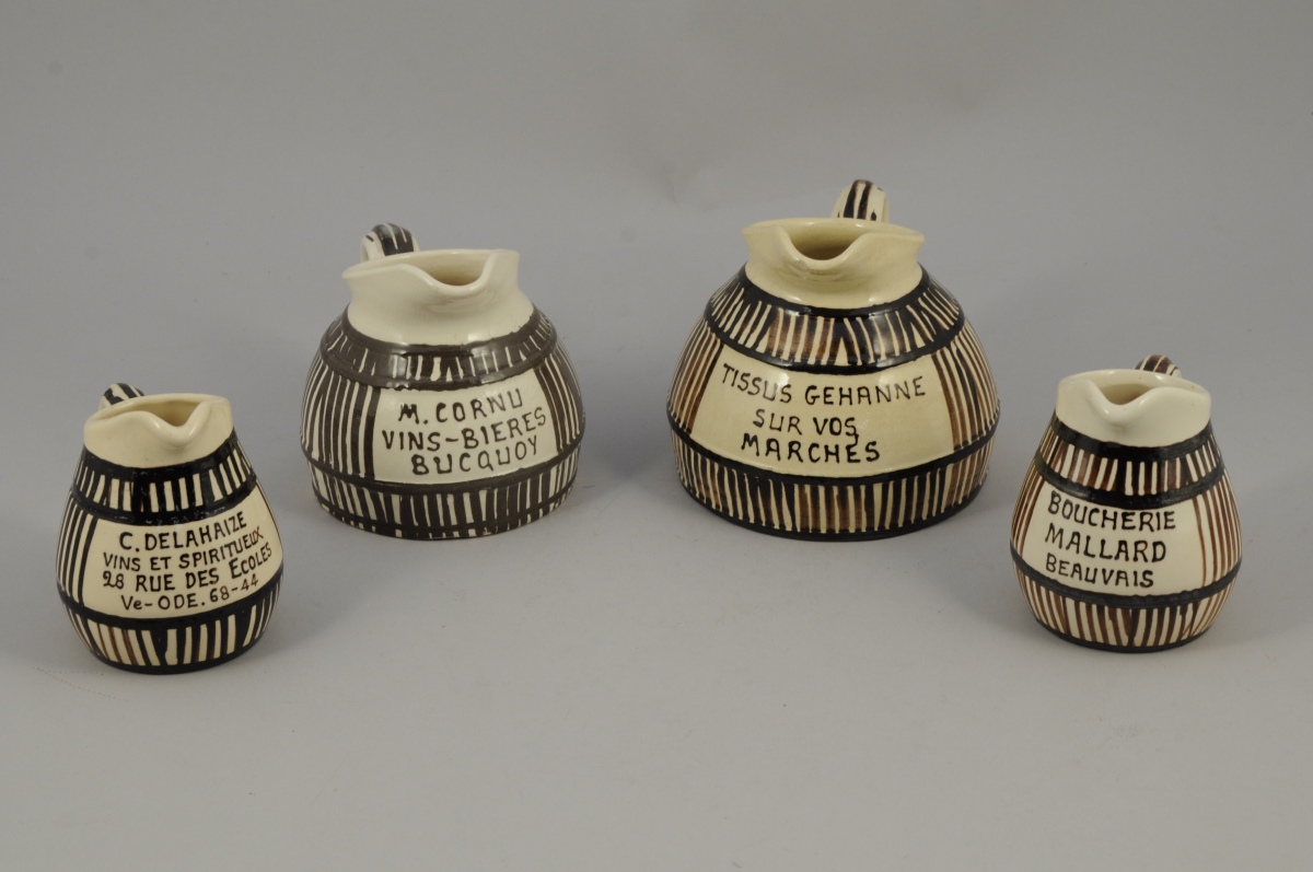 Réunion de quatre PICHETS PUBLICITAIRES en terre cuite vernissée, à décor strié en brun sur fond blanc. Ils sont marqués :