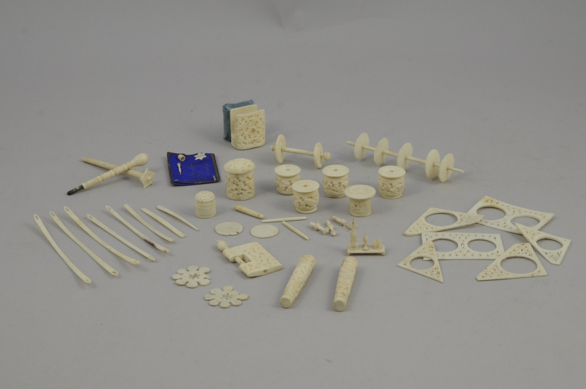 RÉUNION d'ÉLÉMENTS de NÉCESSAIRE à COUTURE et divers en os et ivoire sculpté tels que dés à coudre, pique aiguille, boîtes.(accidents et manques)