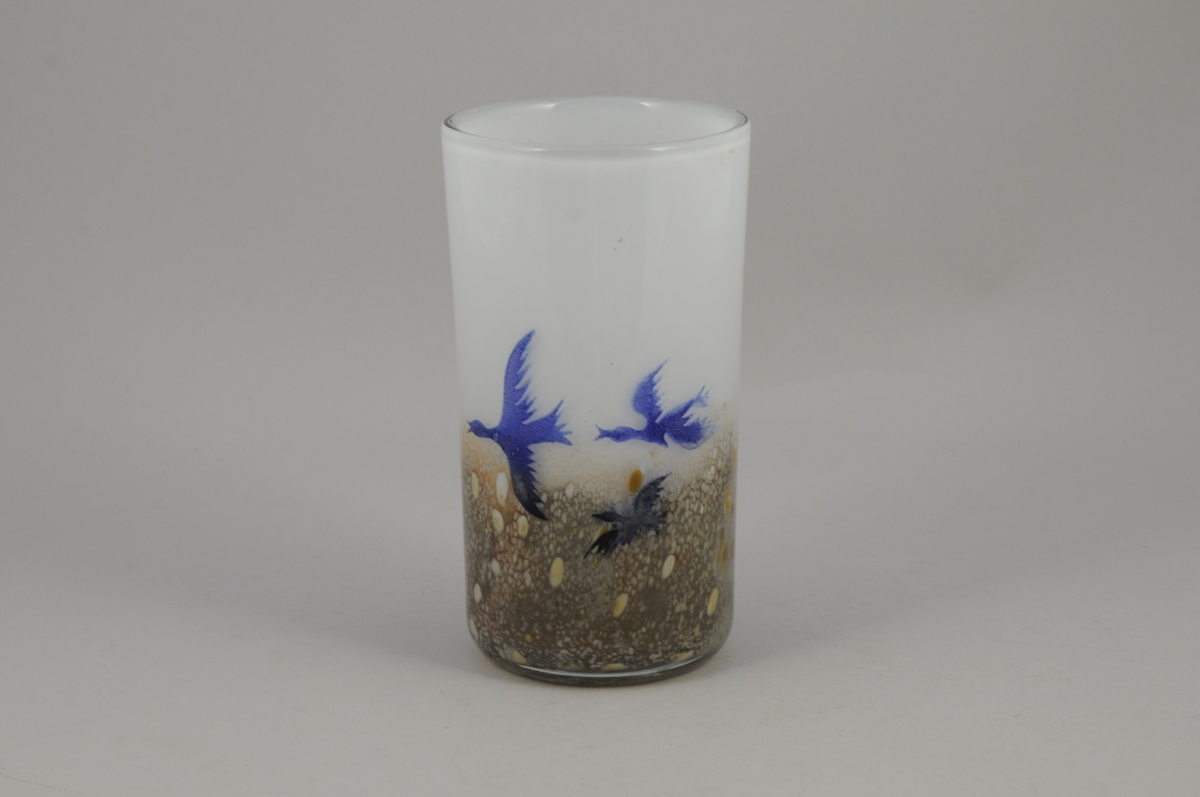 VASE tubulaire en verre polychrome figurant des oiseaux en vol et présentant, dans sa partie inférieure, un décor de cailloutis. Haut. 21,5, Diam. 12 cm.