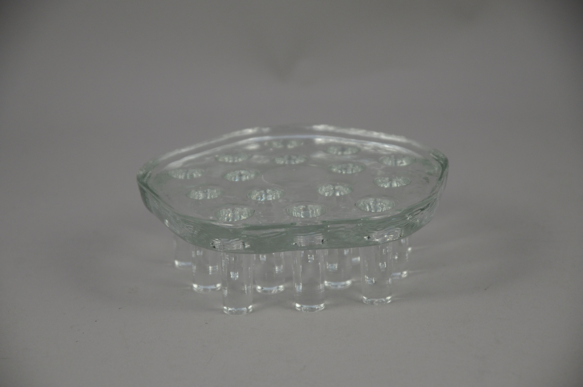 DESSOUS de PLAT de forme chantournée en verre reposant sur quinze pieds coniques. Haut. 6,5, Diam. 19,5 cm. XXème.