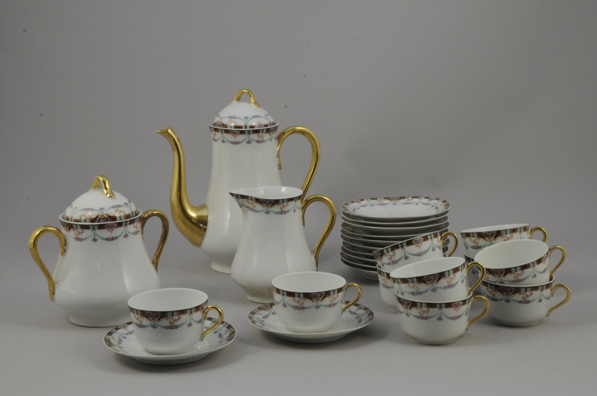 CHATRES sur CHER. SERVICE à CAFÉ en porcelaine blanche. Décor polychrome et or de frises à motifs géométriques, de lambrequins, de potiches fleuries, de rinceaux et de guirlandes de roses. Il comprend : une cafetière, un pot à lait, un sucrier, 10 tasses et 12 sous-tasses. XXème.