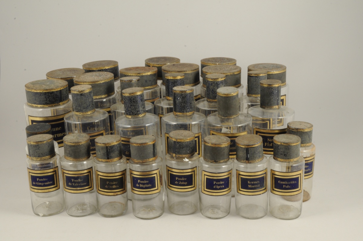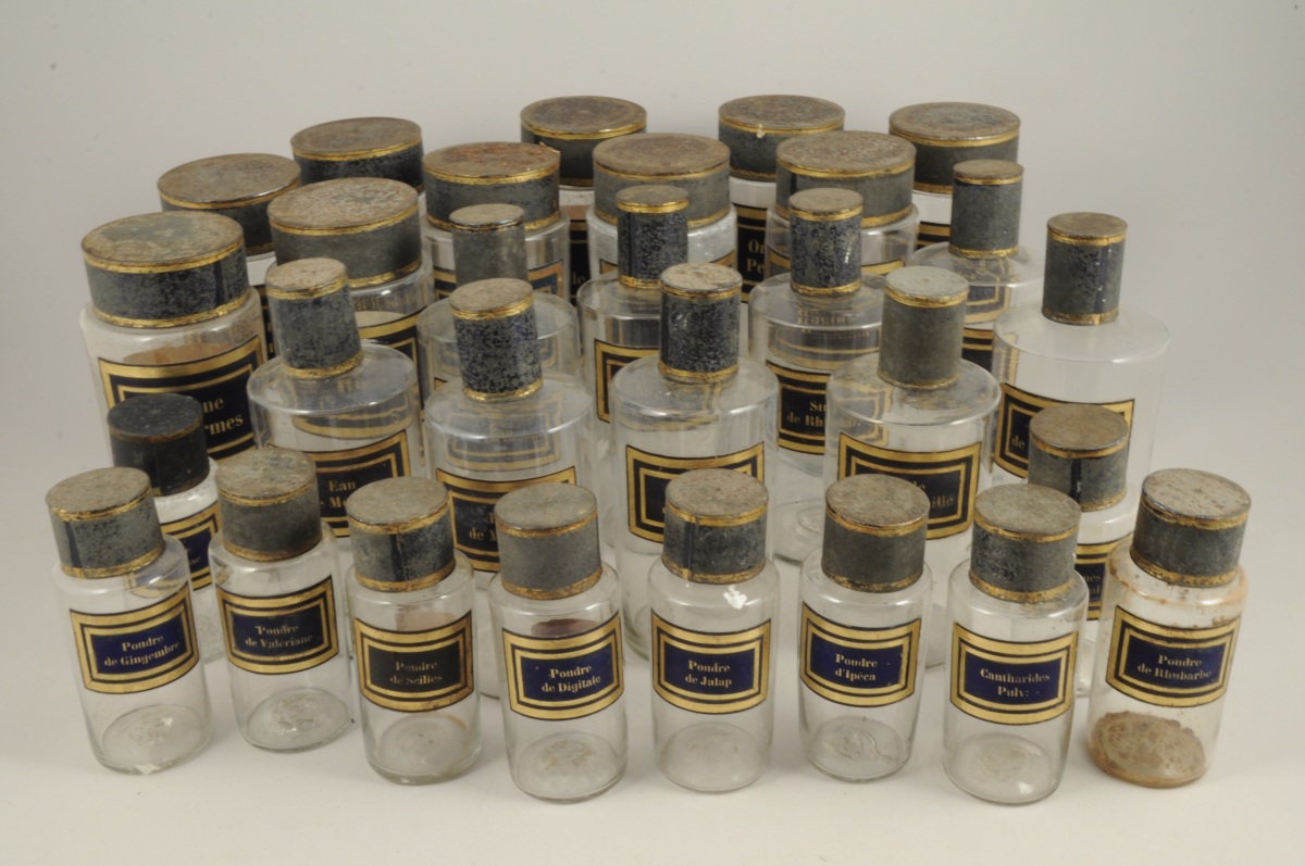 LOT DE 29 POTS DE PHARMACIE en verre soufflé avec étiquettes et protège-bouchons en métal d'origine. XIXème. Trois hauteurs différentes : 23, 22 et 15,5 cm. (usures d'usage)