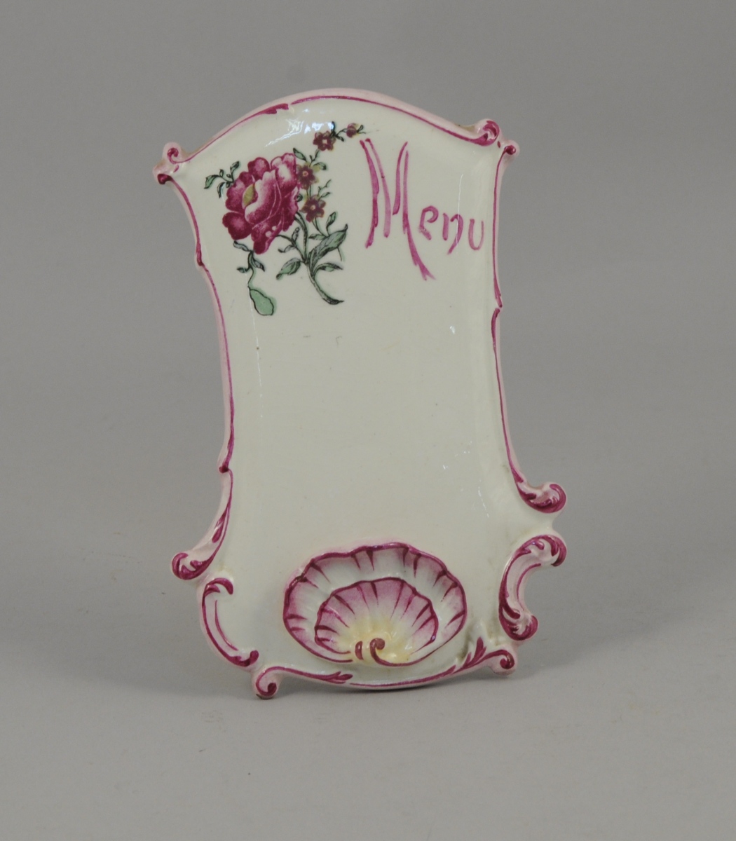 GIEN. PORTE-MENU en faïence à bord contourné. Décor polychrome d'une rose à côté de l'inscription "Menu" en pourpre. Coquille rocaille en relief, filets se terminant en rinceaux pourpres sur le bord. Marque au tampon au château "GIEN", marque utilisée de 1866 à 1875 Long. 17,7, Larg. 12,2 cm.