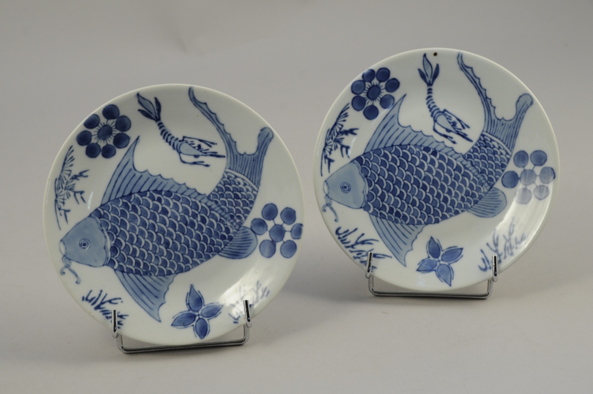 PAIRE D'ASSIETTES en porcelaine. Décor camaïeu bleu en plein d'une carpe, d'une écrevisse et de plantes aquatiques dans le goût des porcelaines japonaises. Diam. 18 cm.