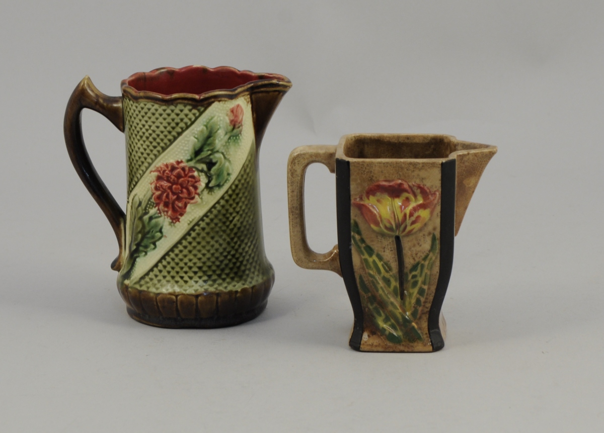DEUX PICHETS en barbotine. Décor polychrome de fleurs sur fond marron, pour l'un, et vert. Marqués "TL", pour l'un, et "776". Haut. 13,5 et 12,5 cm.