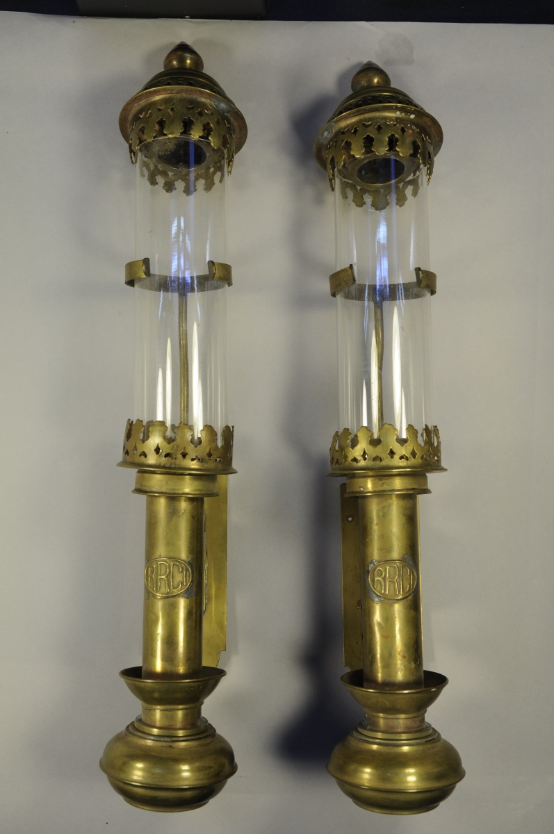 PAIRE DE LAMPES A PÉTROLE de fixation murale en verre et laiton surmontées d'un chapeau en laiton ajouré. Elles sont siglées RRCI. Haut. 40, Diam du tube. 5, Prof. 9 cm.