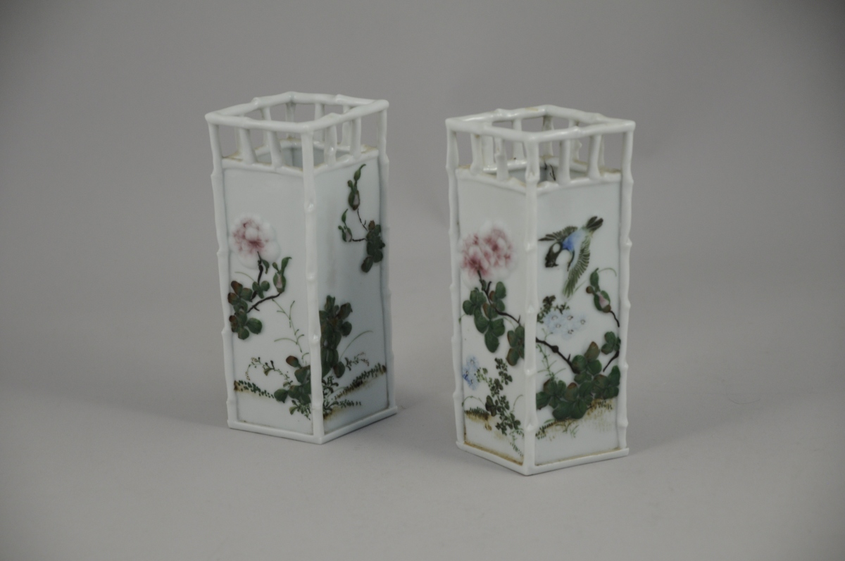 PAIRE de VASES de forme losangique en porcelaine à décor polychrome en relief de branche feuillagées et fleuries et d'une mésange. Les arrêtes à l'imitation de tiges de bambou, registre que l'on retrouve à l'amortissement formant une cloture. Marque de forme ovale estampée et présentant deux idéogrammes. Haut. 20 cm.