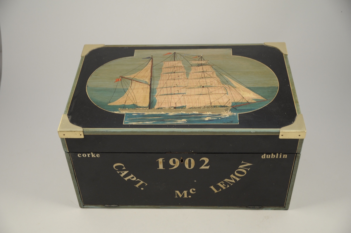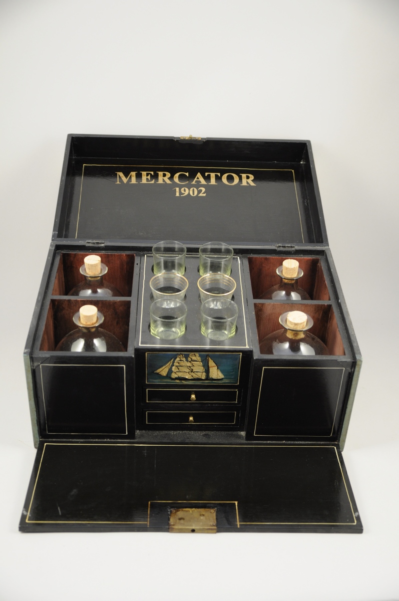 COFFRE à LIQUEUR de forme rectangulaire en bois laqué noir. Le couvercle peint d'un trois mâts toutes voiles dehors. Renforts en laiton aux quatre coins. Il découvre deux tiroirs et quatre compartiments recevant une carafe en verre soufflé et six emplacements recevant des verres (quatre en verre soufflé et deux à filets or rapportés). Marqué au pochoir : "1902 / CAPT. Mc. LEMON / corke / dublin" et "MERCATOR 1902". Fin du XXème. Haut. 25,2, Larg. 48,2, Prof. 30,5 cm.