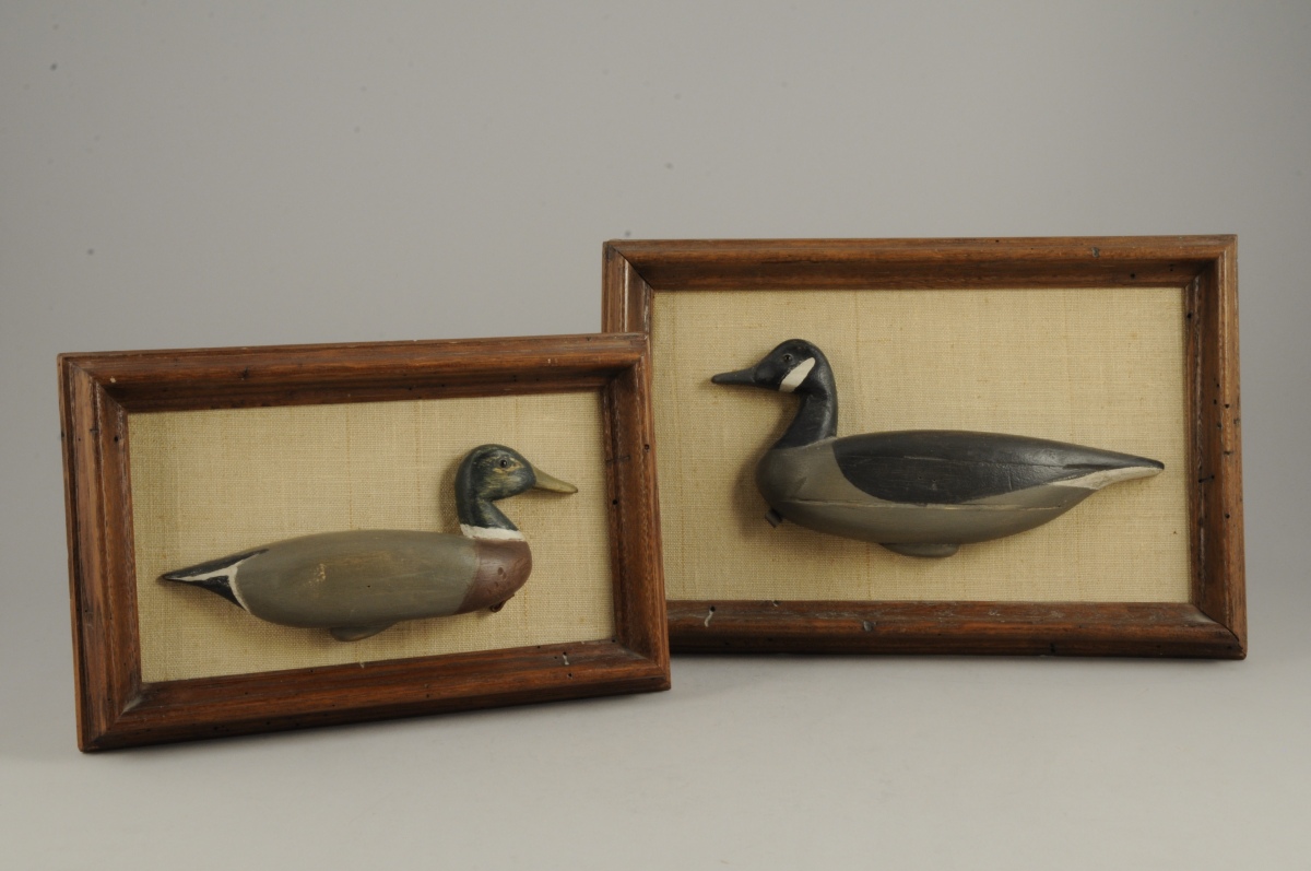 LOT de DEUX CANARDS APPELANT en coupe de profil peint au naturel dans un cadre en bois mouluré. Au dos, marque à l'encre : "CANADA GOOSE / New Jersey origin / circa 1890" et "MALARD / Delaware origin / circa 1865". XXème. Haut. 25,5, Larg. 38,2 et Haut. 20,3, Larg. 31,7 cm.