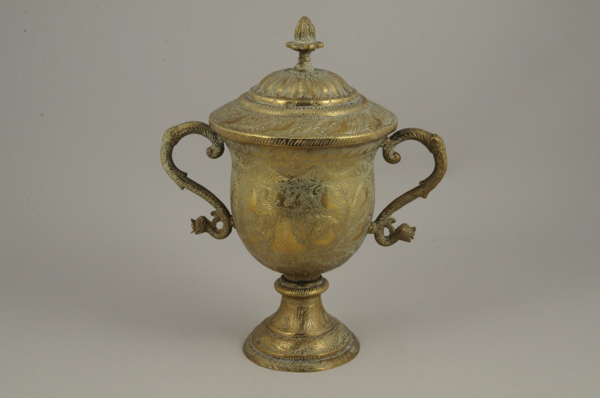 POTICHE couverte à deux anses en laiton ciselé et repoussé. Décor de quatre personnages orientaux dansant, d'oiseaux, de feuillages, de perles et de stries. Anses se terminant en tête de chien. Moyen-Orient, Inde ? XXème. Haut. 30,8 cm.