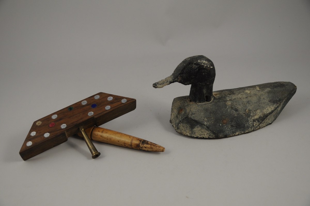 On y joint un CANARD APPELANT en bois peint. Origine Baie d'Authie. Haut. 14, Long. 30 cm.